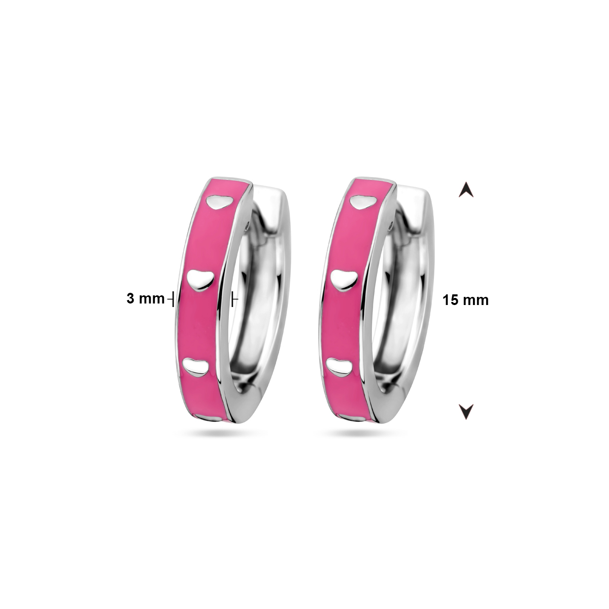 Gerhodineerd 925 zilveren klapoorringen met roze emaille. De oorringen hebben een afmeting van 15x3mm.