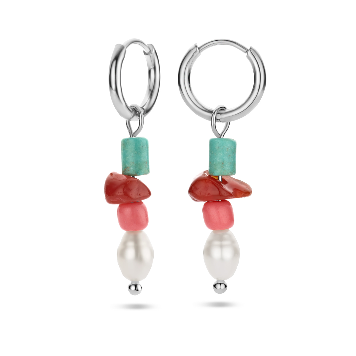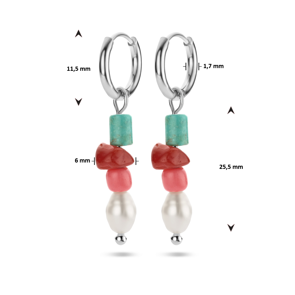 Stalen oorringen uitgevoerd met synthetische turquoise, jade en parel. De oorringen hebben een diameter van 11.5mm.