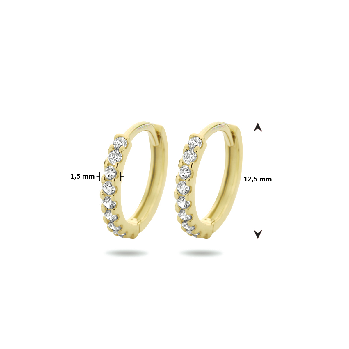 Beschrijving: Chique geelgouden klapcreolen van 12.5x1.5mm uitgevoerd met een luxe rijzetting van briljant geslepen zirkonia. De klapcreolen zijn verder uitgevoerd met een stevige scharnier sluiting. Tip: Combineer deze klapcreolen met andere sieraden uit onze collectie en creeer zo een schitterende set!.