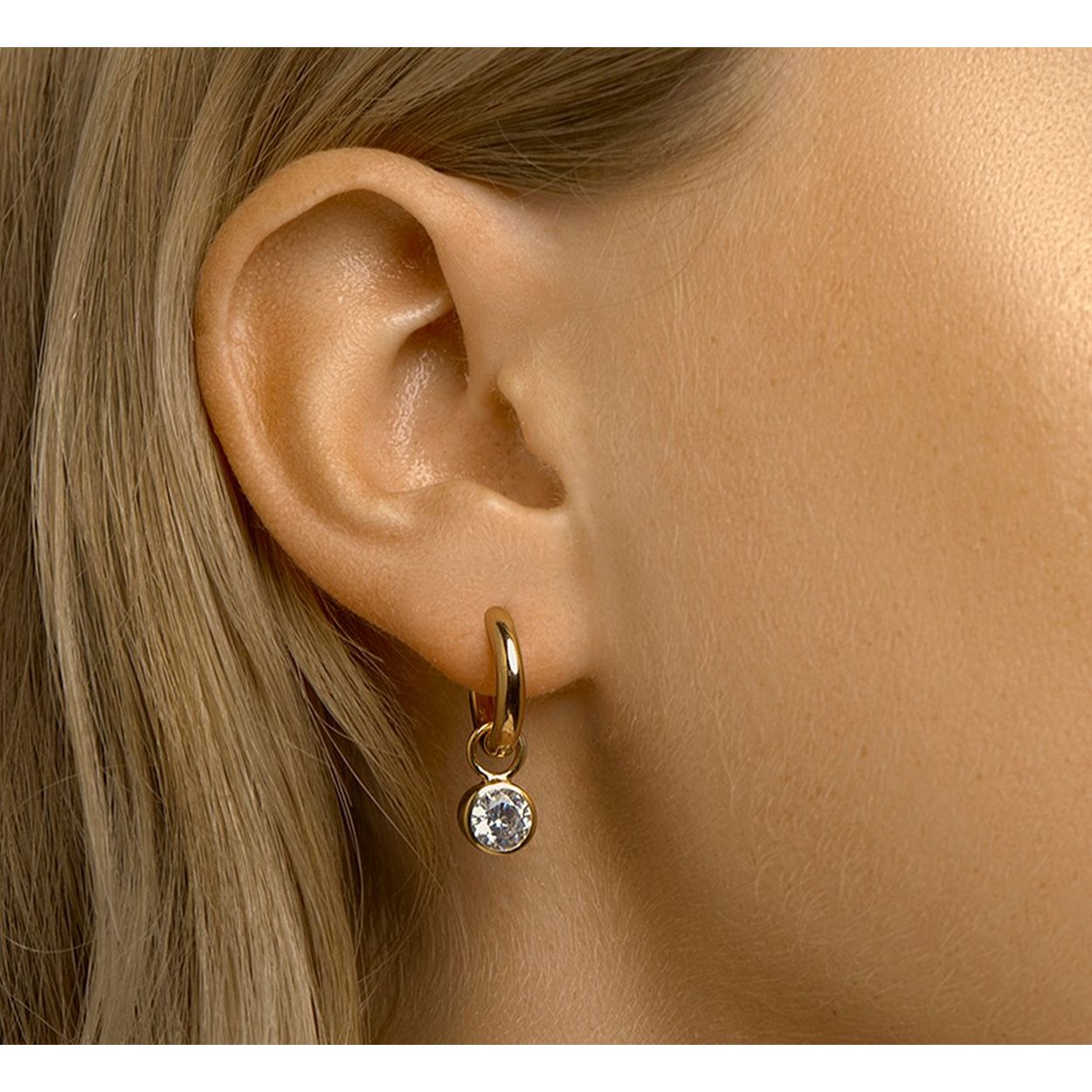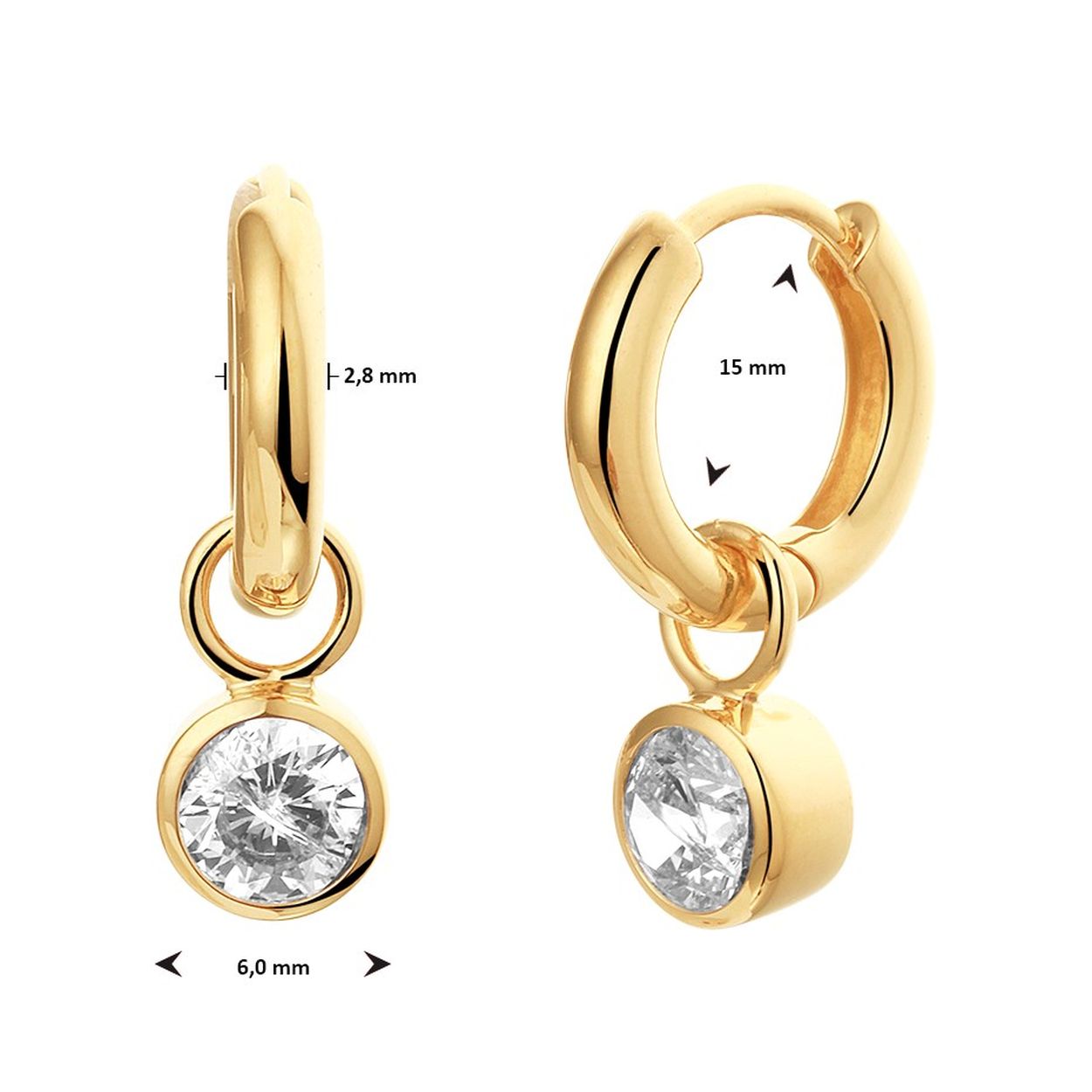 Geelgoud op 925 zilveren klapoorringen uitgevoerd met een hanger met daarin een heldere zirkonia. De oorringen hebben een afmeting van 15x2.8mm. De hanger heeft een diameter van 6mm.
