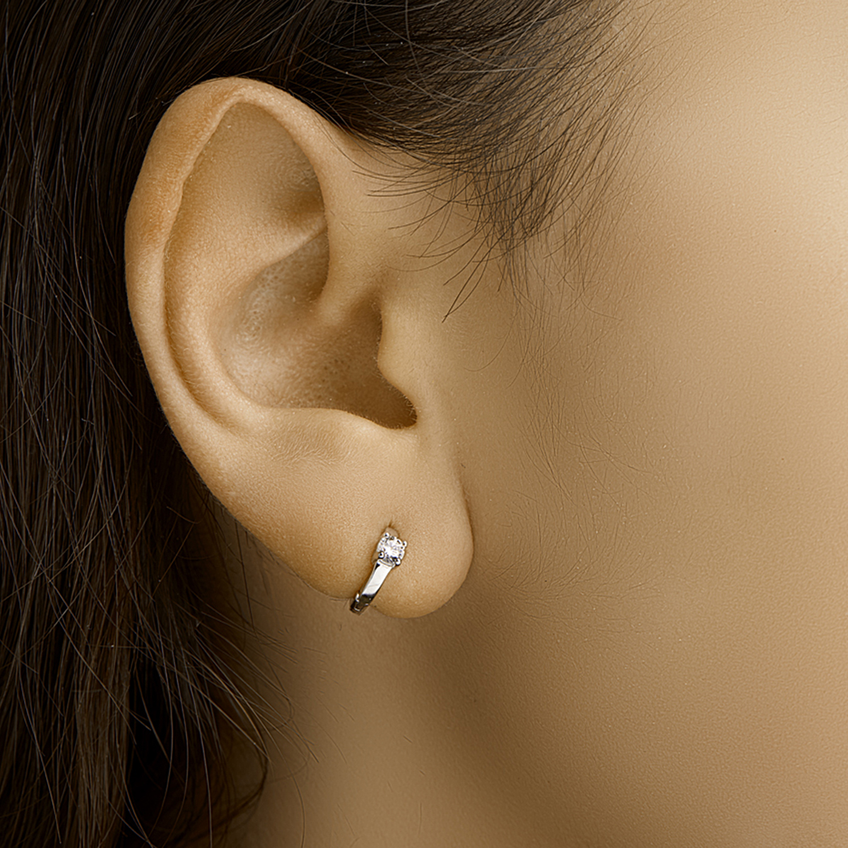 Gerhodineerd 925 zilveren oorringen met scharnier uitgevoerd met een heldere zirkonia. De oorringen hebben een diameter van 9mm.
