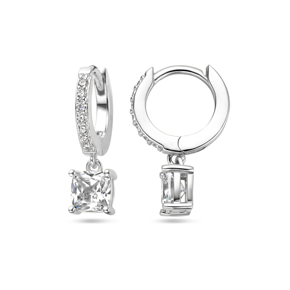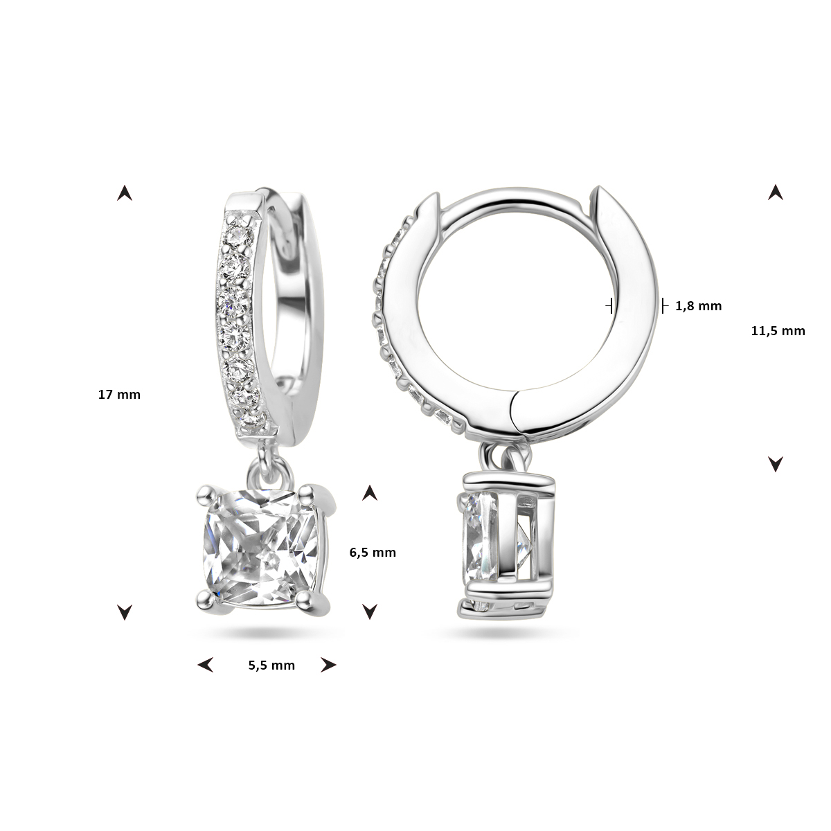 Gerhodineerd 925 zilveren klapoorringen uitgevoerd met zirkonia. De oorringen hebben een totale hoogte van 17mm.