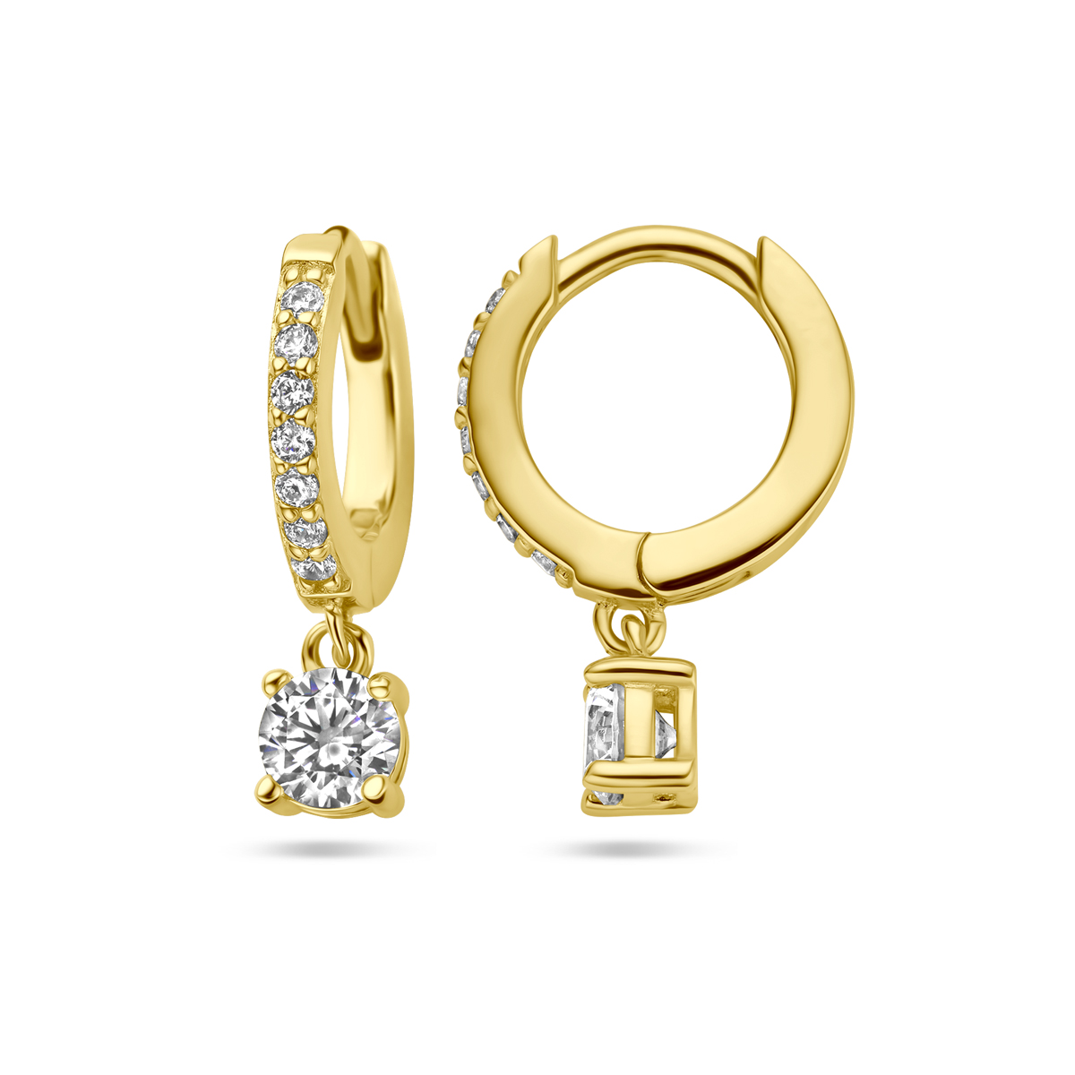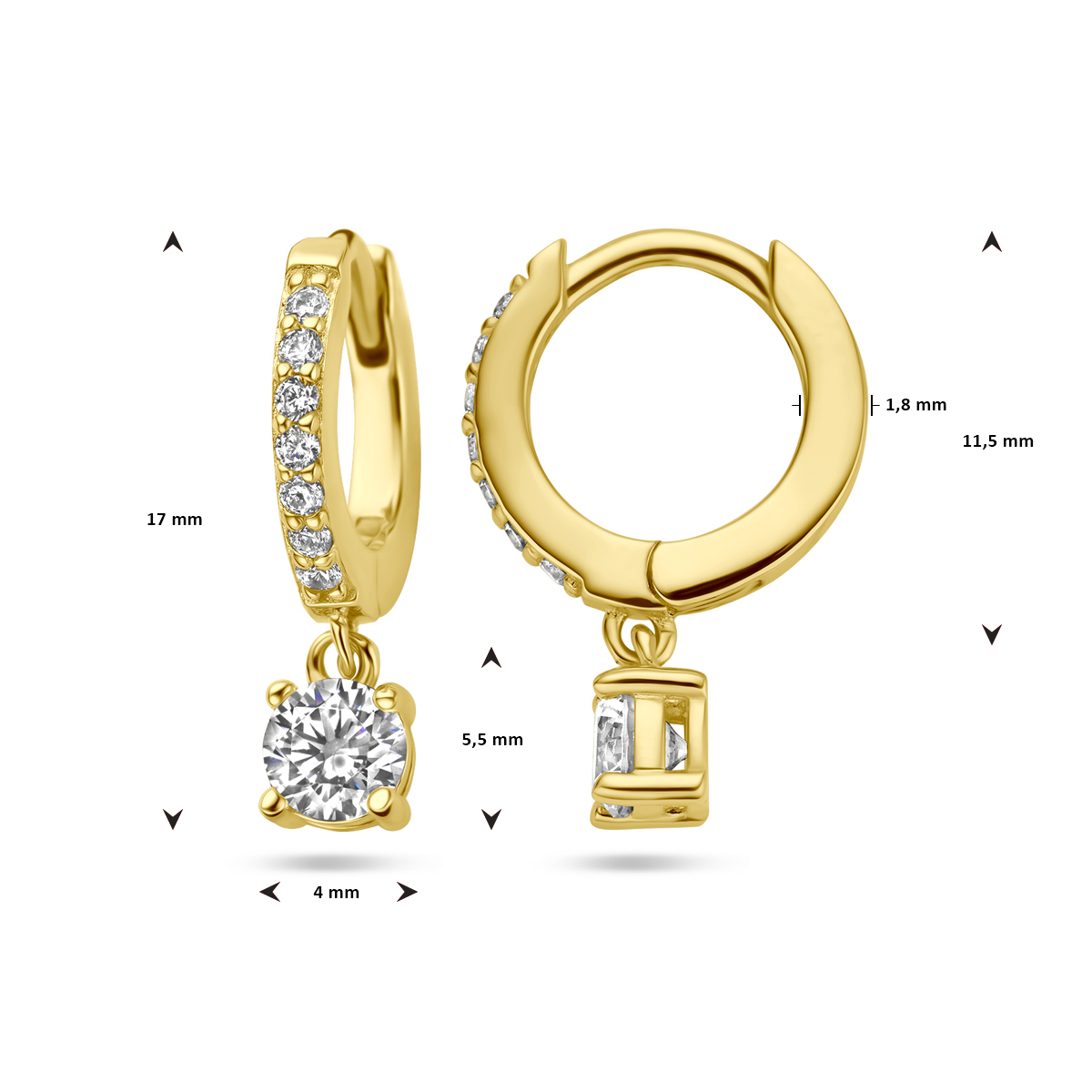 Geelgoud op 925 zilveren klapoorringen uitgevoerd met zirkonia. De klapoorringen hebben een totale hoogte van 17mm. Geen garantie op plating.