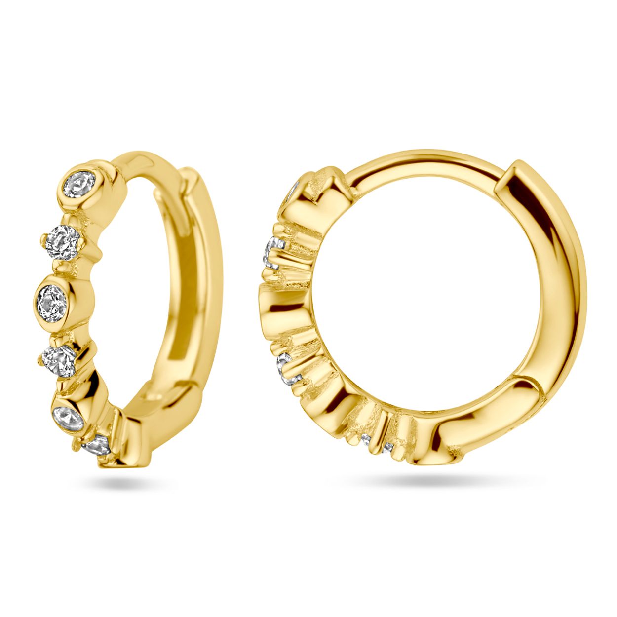 Geelgoud op 925 zilveren klapoorringen uitgevoerd met zirkonia. De klapoorringen hebben een afmeting van 11.5x2mm. Geen garantie op de plating.