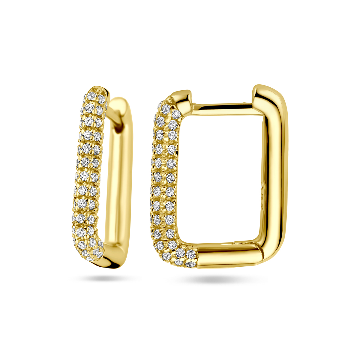 Geelgoud op 925 zilveren klapoorringen uitgevoerd met zirkonia. De klapoorringen hebben een afmeting van 14.5x2mm. Geen garantie op de plating.