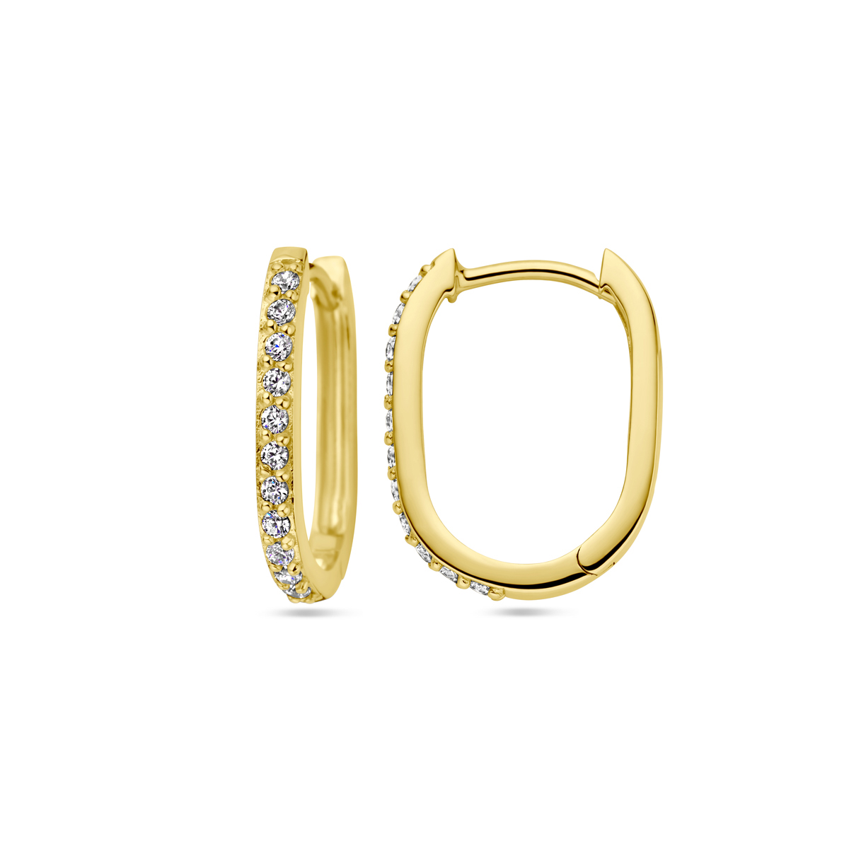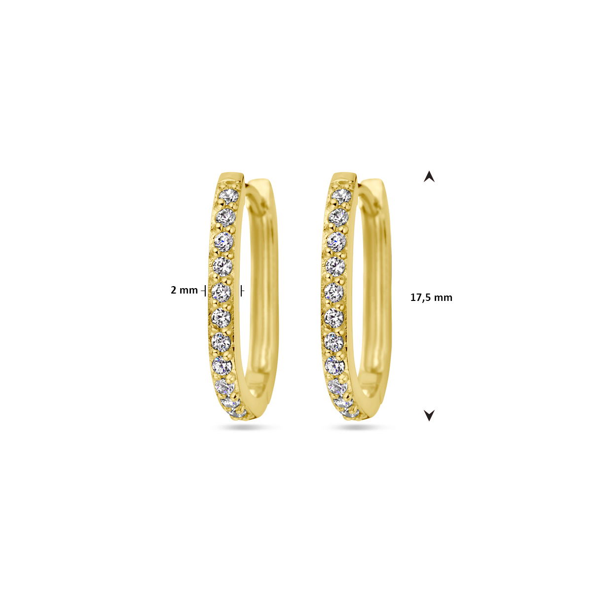 Geelgoud op 925 zilveren klapoorringen uitgevoerd met zirkonia. De klapoorringen hebben een afmeting van 17.5x2mm. Geen garantie op de plating.