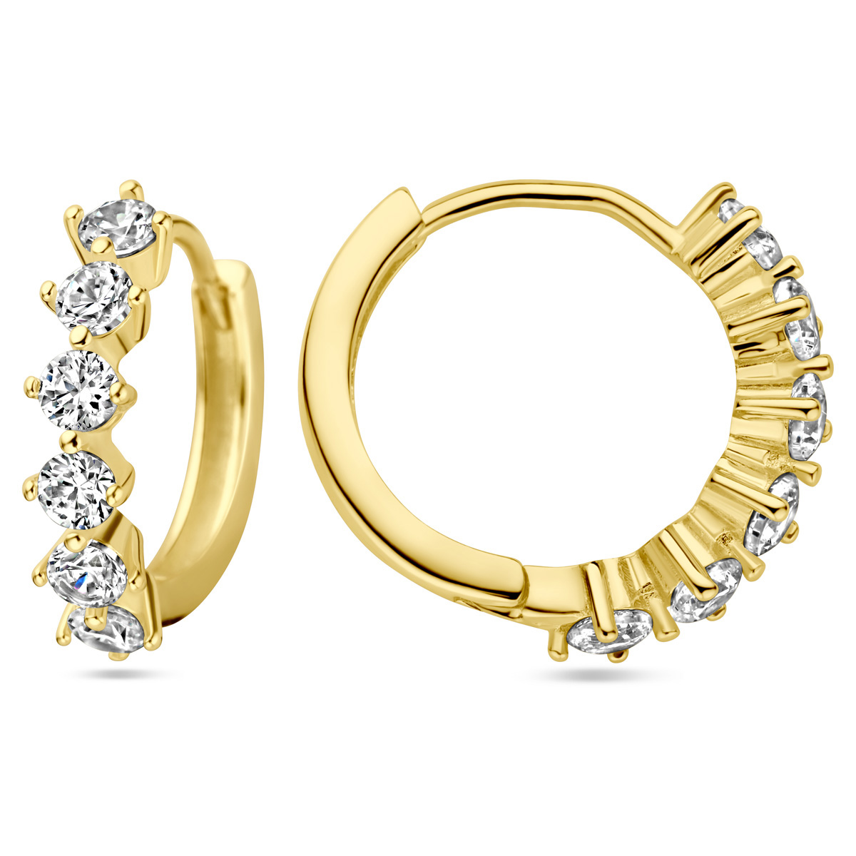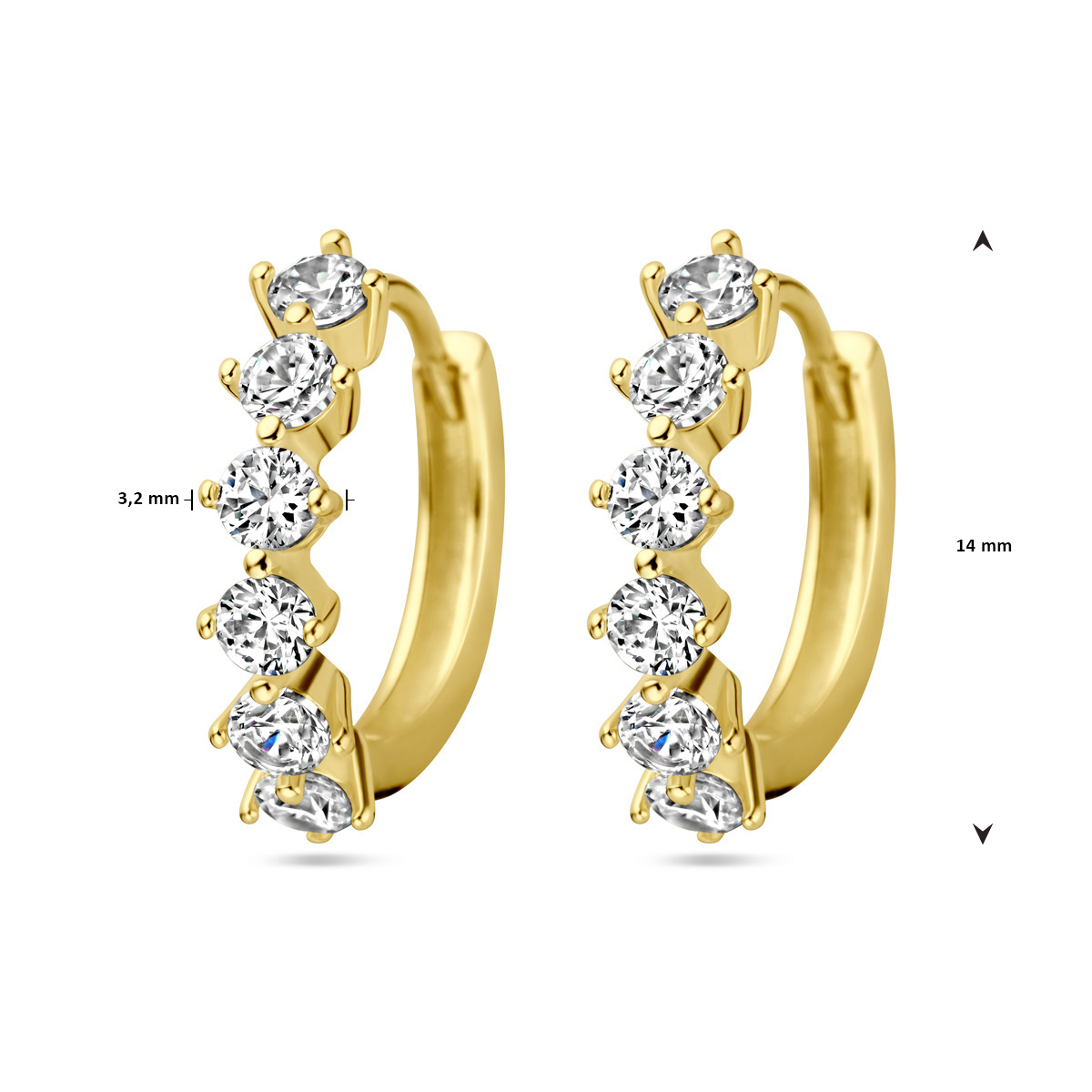 Geelgoud op 925 zilveren klapoorringen uitgevoerd met zirkonia. De klapoorringen hebben een afmeting van 14x3.2mm.