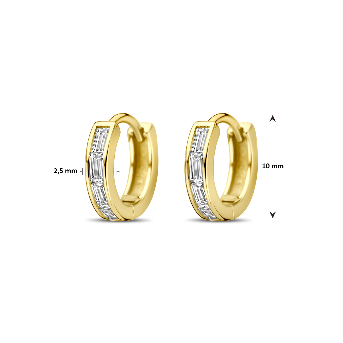 Geelgoud op 925 zilveren klapoorringen uitgevoerd met zirkonia. De oorringen hebben een diameter van 10mm. Geen garantie op plating.