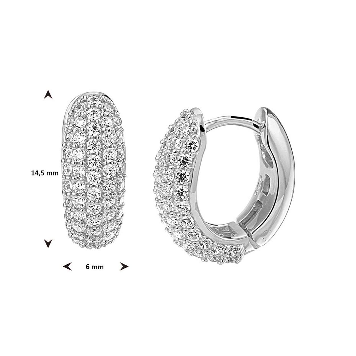 Gerhodineerd 925 zilveren klapoorringen uitgevoerd met een schitterend zirkonia vlak. De oorringen hebben een afmeting van 14.5x6mm.