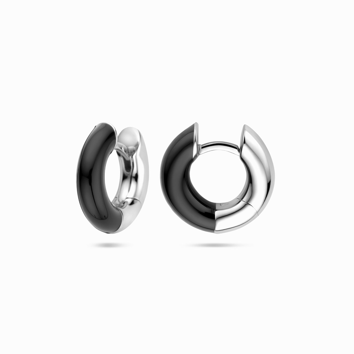 Gerhodineerd 925 zilveren oorringen uitgevoerd met zwart emaille. De oorringen hebben een breedte van 4mm.
