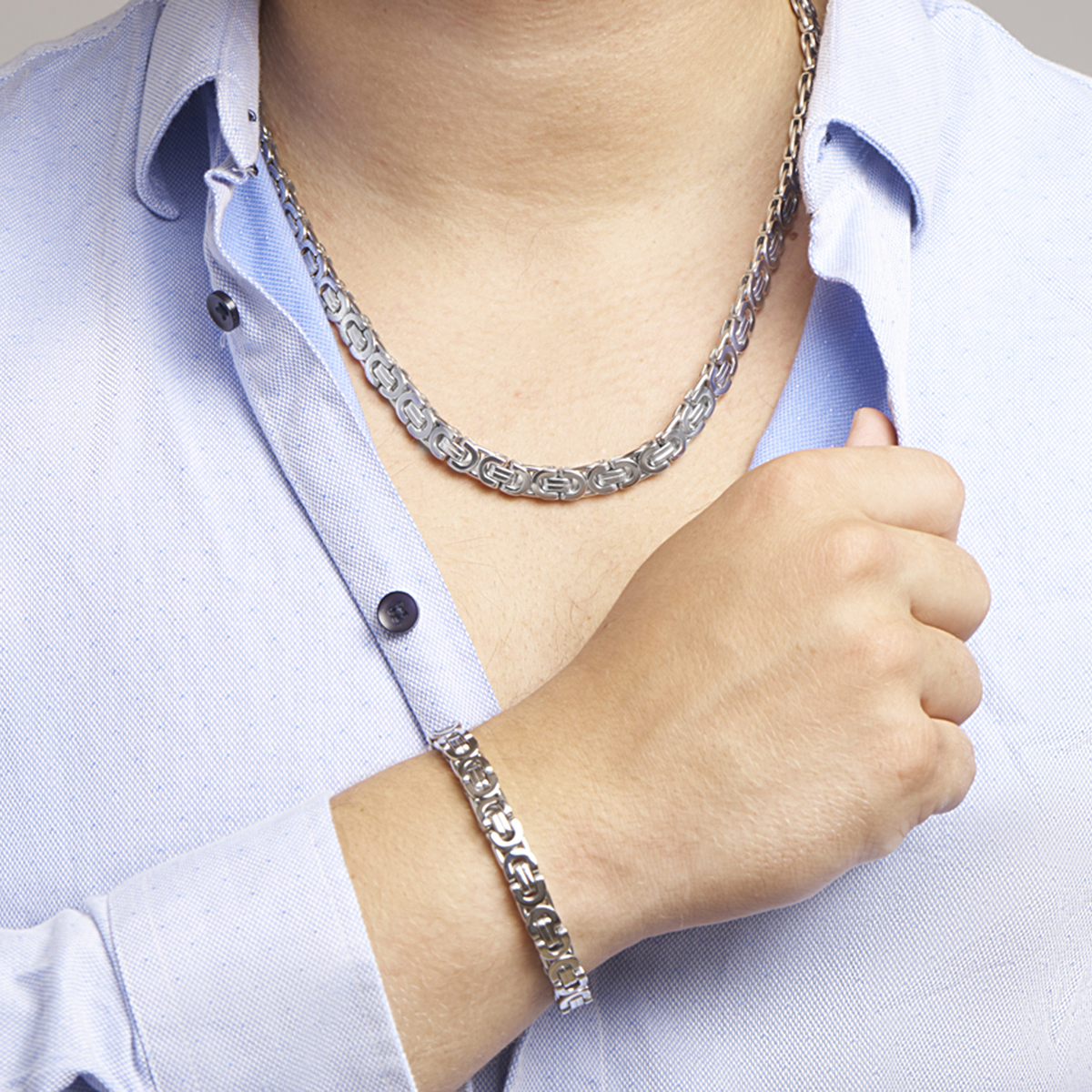 Stalen armband met een koningsschakel. De armband heeft een draaglengte van 21cm en een stevige karabijn sluiting.