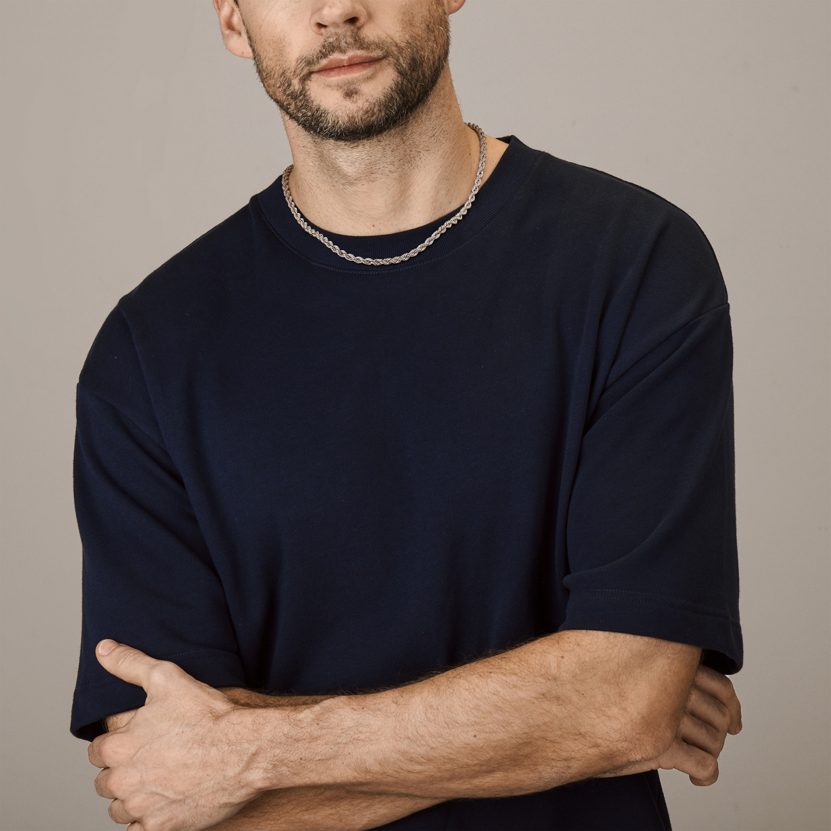 Gerhodineerd 925 zilveren lengte artikel met koord schakel. De schakelbreedte is 4.0mm en is uitgevoerd met karabijn sluiting.