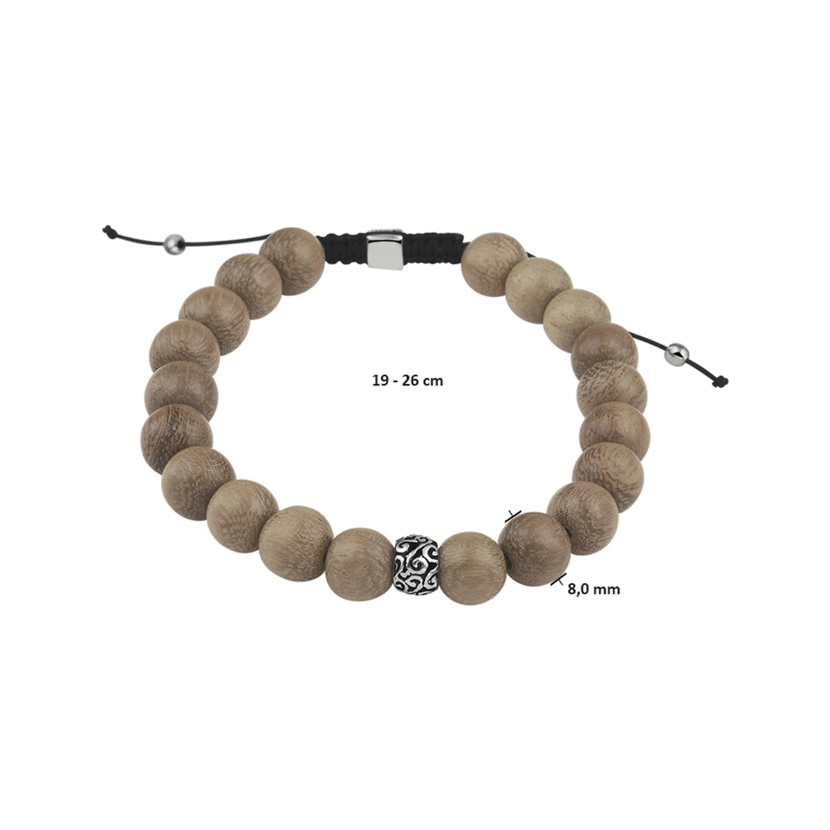 Stoere armband uitgevoerd met lichtbruin hout en 925 zilveren elementen. De armband heeft een breedte van 8mm en een draaglengte van 19 tot 26cm.