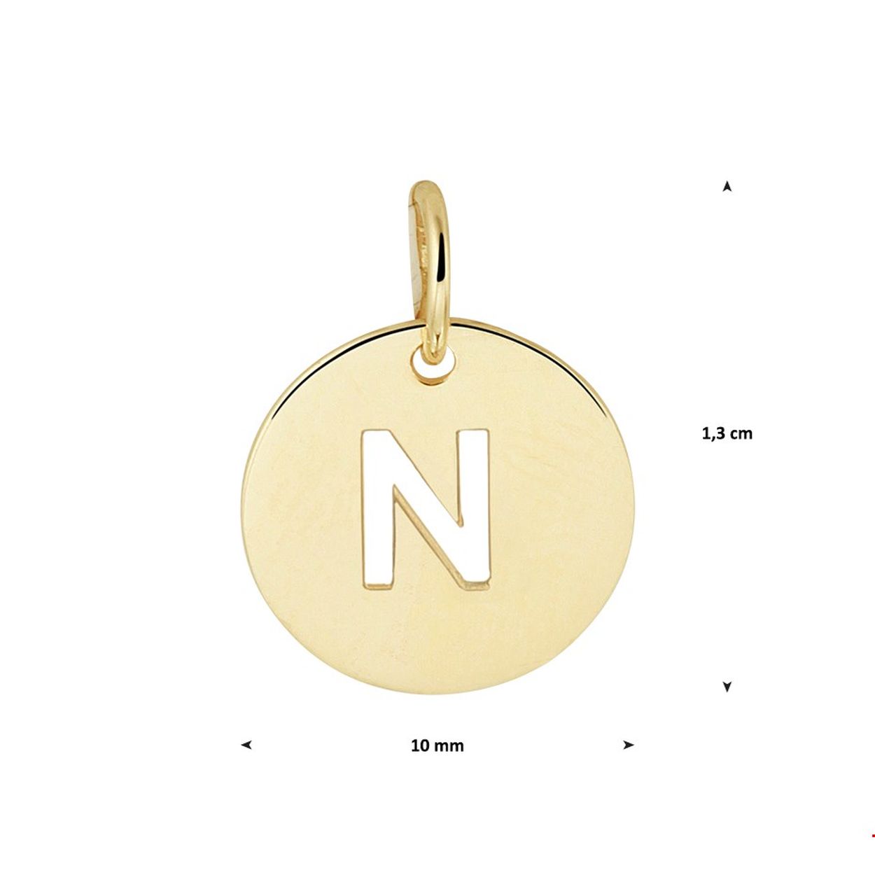 Beschrijving: Geelgouden ronde letter N hanger. De hanger heeft een diameter van 10mm en een totale hoogte van 13mm. Tip: Combineer deze betekenisvolle hanger met een bijpassend collier en geef deze cadeau aan een speciaal persoon.