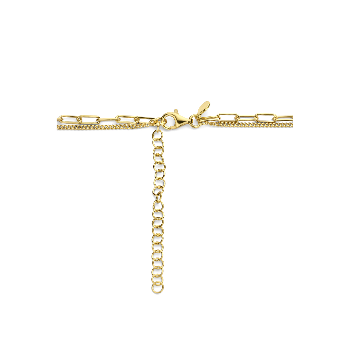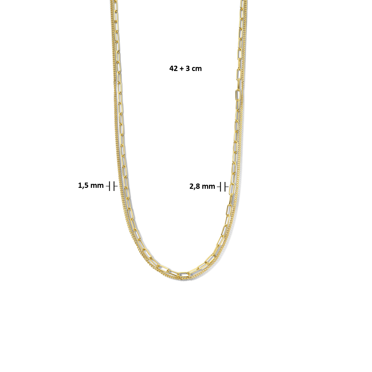 Geelgoud op 925 zilveren collier uitgevoerd met een paperclip schakel van 2.8mm, gourmette schakel van 1,5mm en een karabijn sluiting. Het collier heeft een draaglengte van 42cm en een extensie van 3cm. Geen garantie op plating.