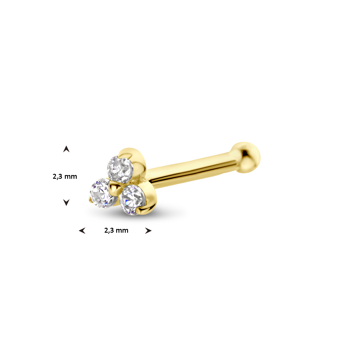 14k Geelgouden neusknopje met zirkonia. Het neusknopje heeft een afmeting van 2.3x2.3mm.