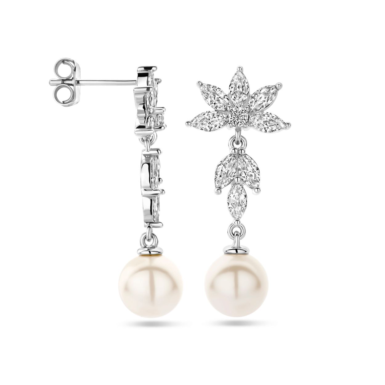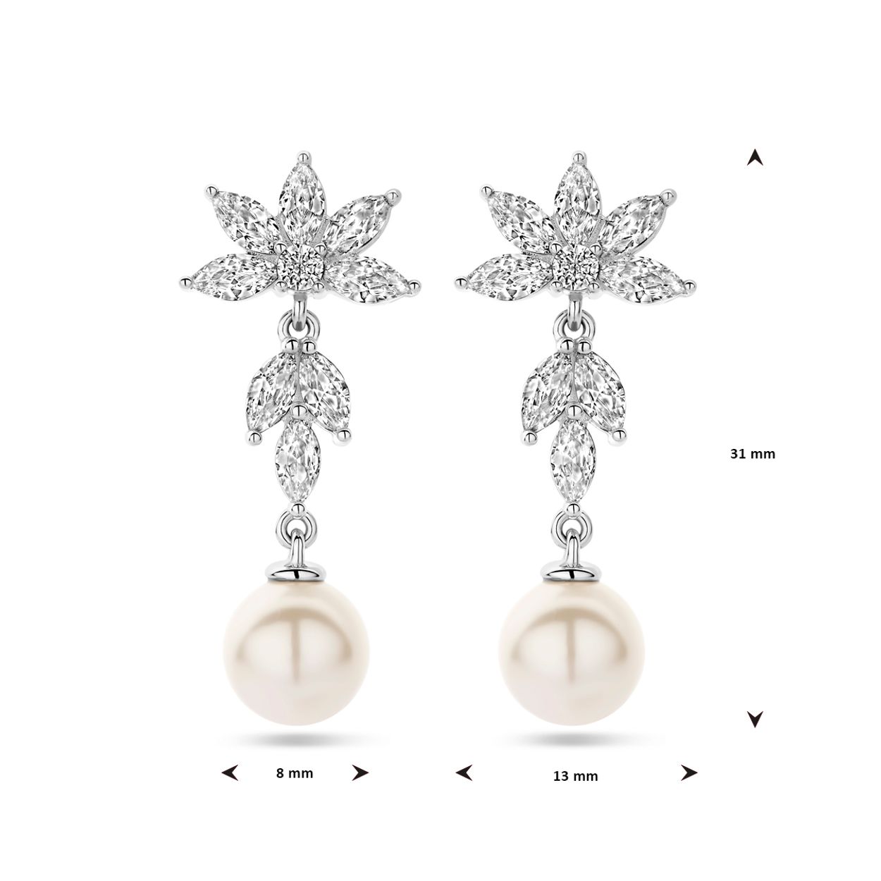 Gerhodineerd 925 zilveren oorhangers uitgevoerd met zoetwaterparel en zirkonia. De oorhangers hebben een totale hoogte van 31mm.