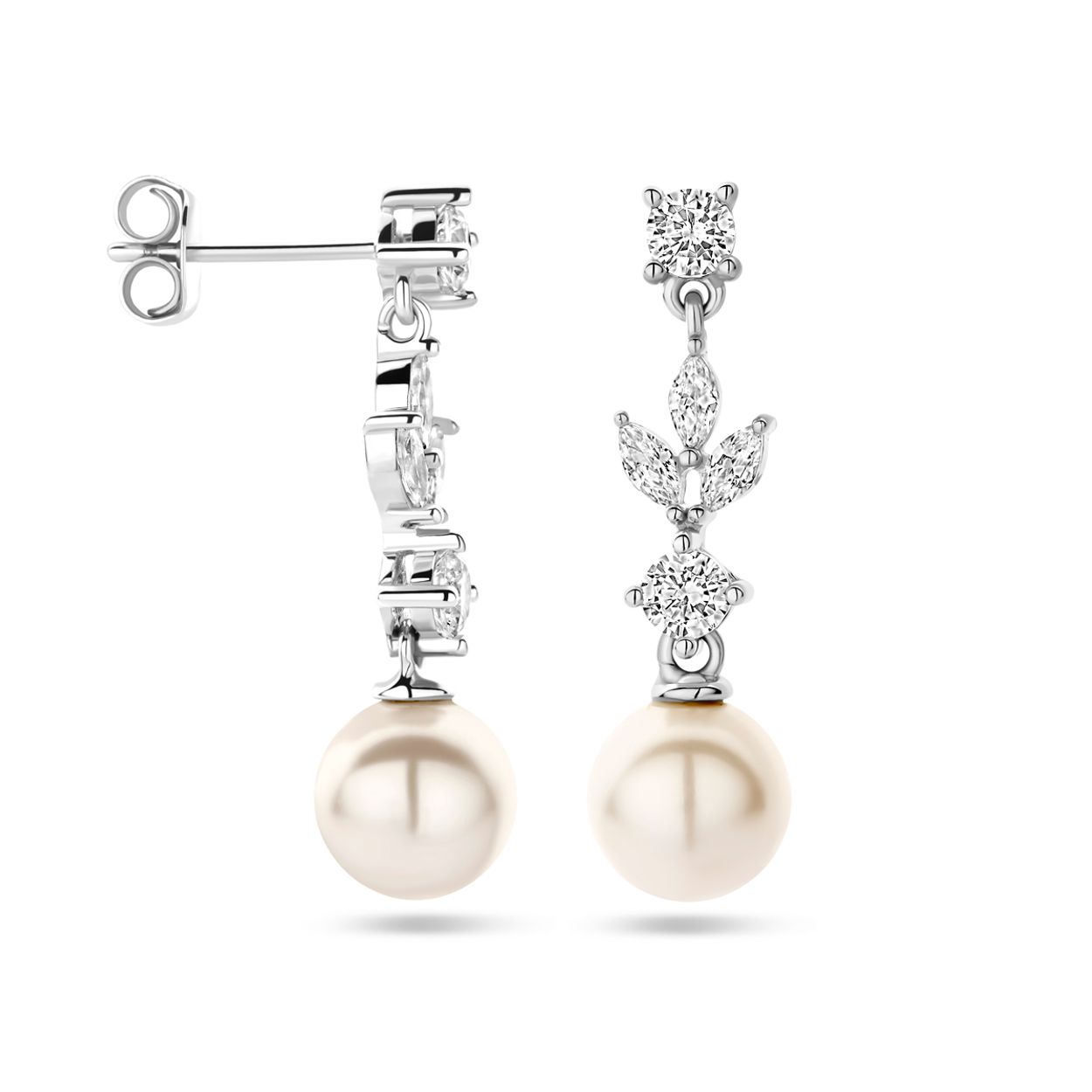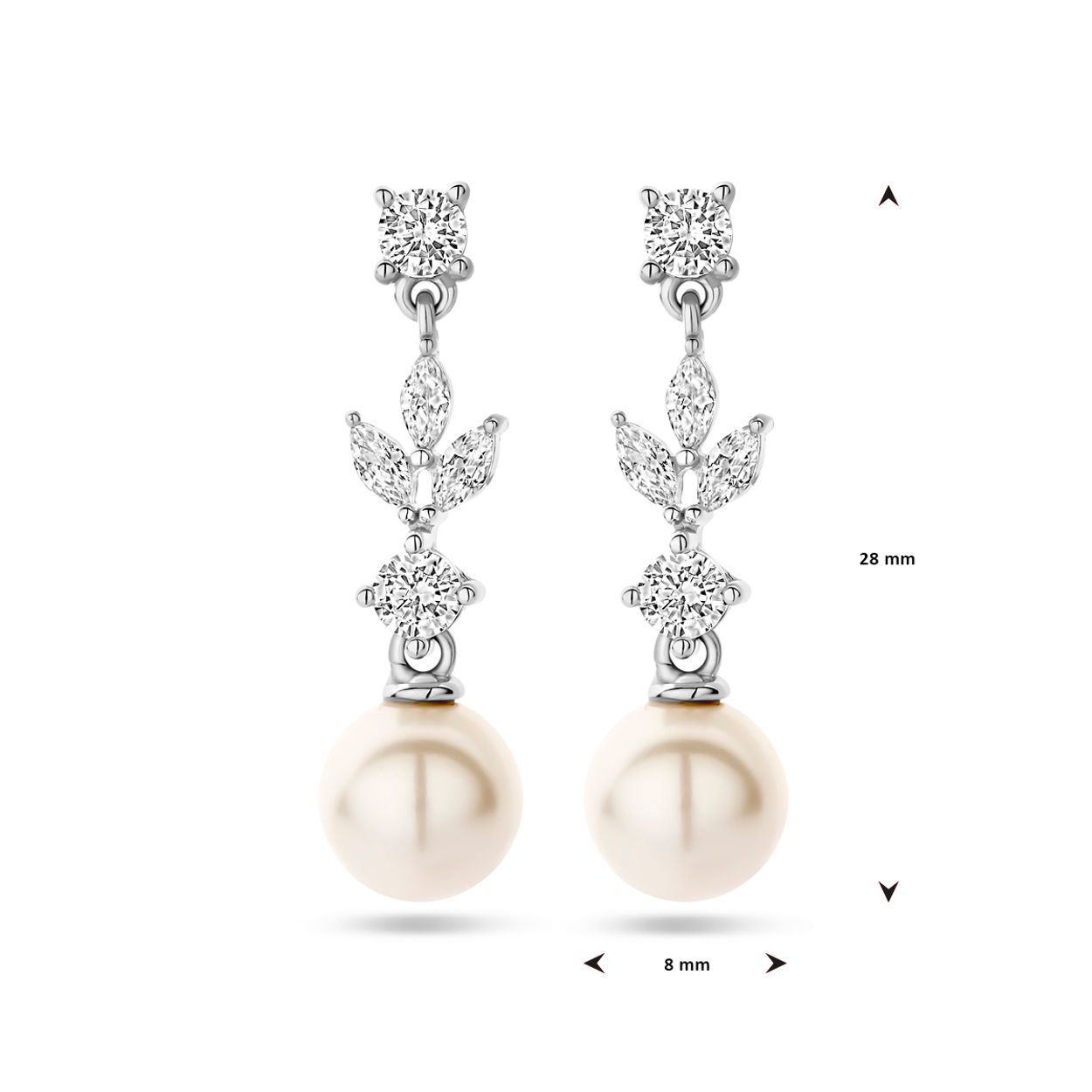 Gerhodineerd 925 zilveren oorhangers uitgevoerd met zoetwaterparel en zirkonia. De oorhangers hebben een totale hoogte van 28mm.