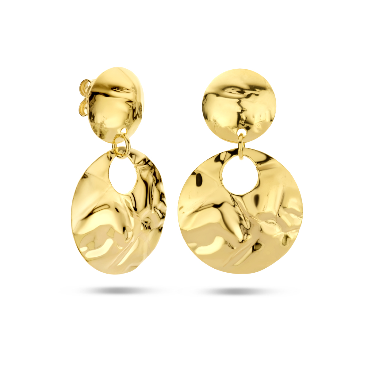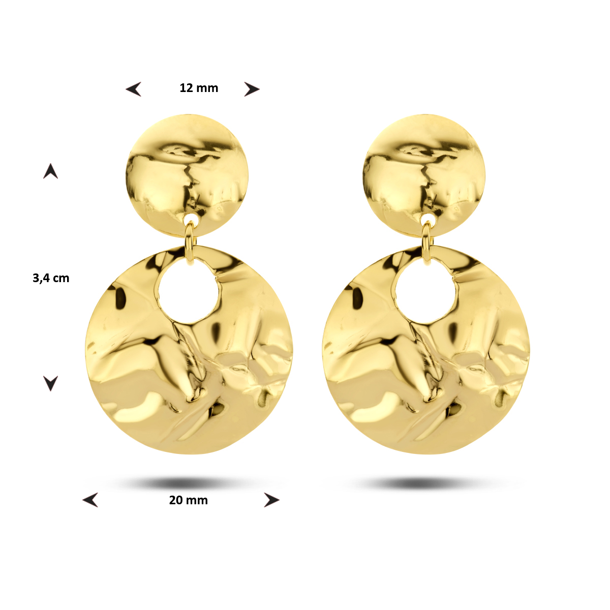 Geelgoud op 925 zilveren ronde oorhangers. De oorhangers hebben een totale hoogte van 3.4cm en een breedte van 20mm. Geen garantie op de plating.