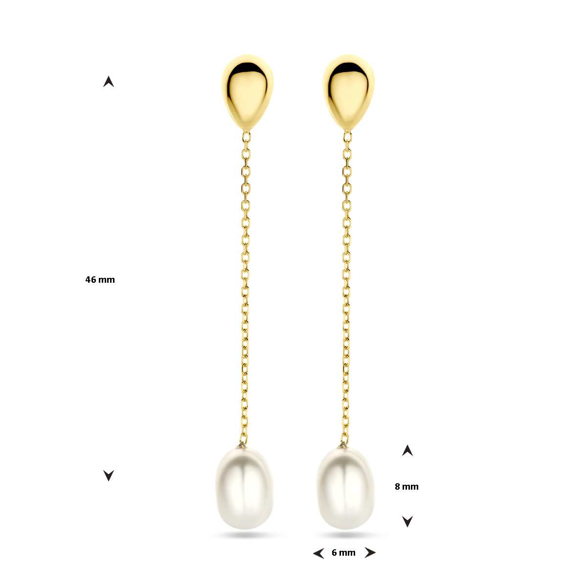 14k Geelgouden oorhangers uitgevoerd met zoetwaterparel. De oorhangers hebben een totale hoogte van 46mm.