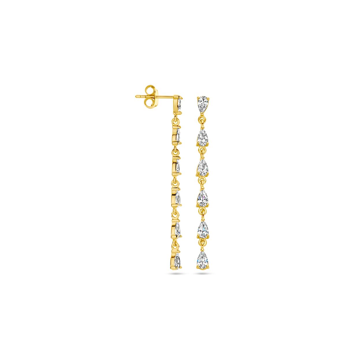 Geelgoud op 925 zilveren oorhangers uitgevoerd met zirkonia. De oorhangers hebben een totale hoogte van 50mm. Geen garantie op de plating.