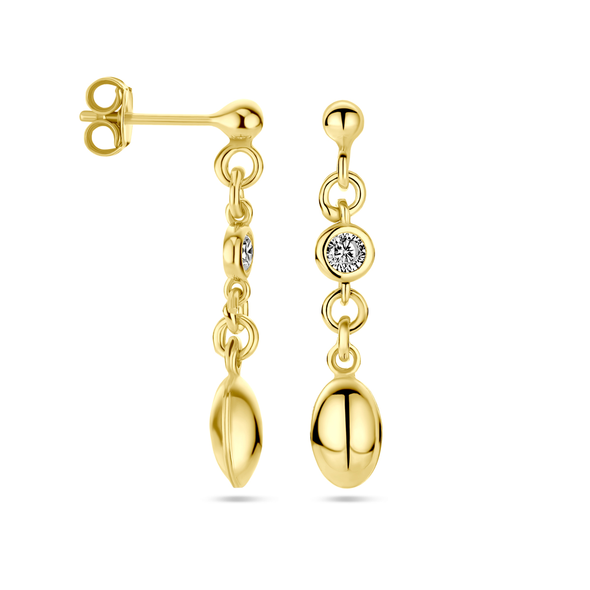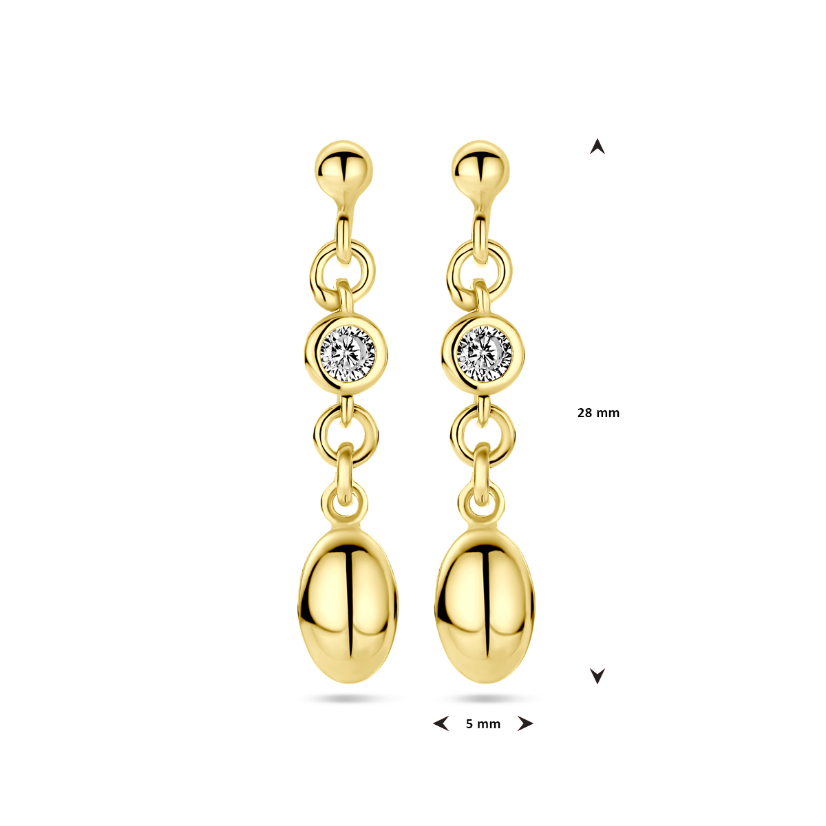 Geelgoud op 925 zilveren oorhangers uitgevoerd met zirkonia. De oorhangers hebben een totale hoogte van 28mm. Geen garantie op de plating.