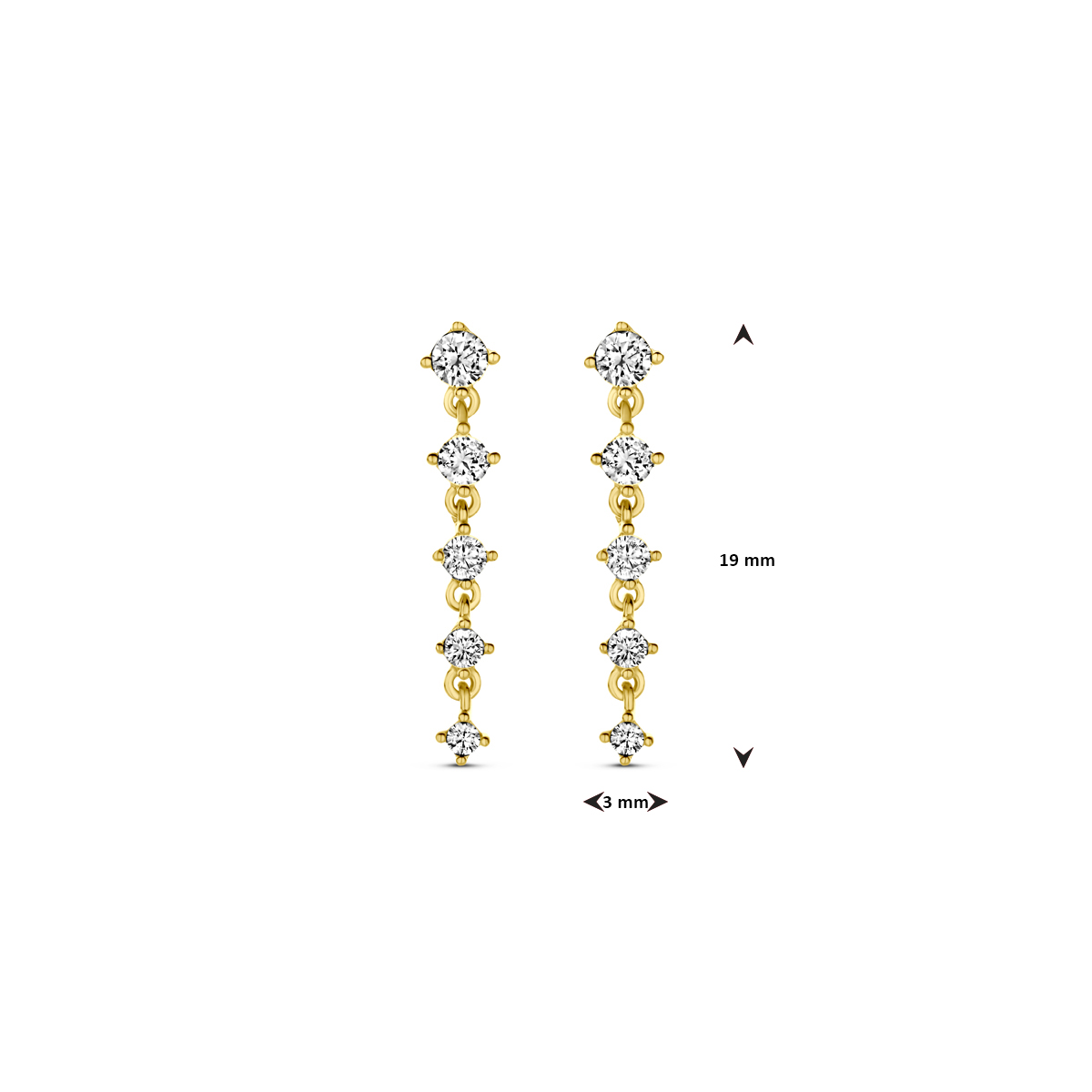 14k Geelgouden oorhangers uitgevoerd met zirkonia. De oorhangers hebben een afmeting van 19x3mm.