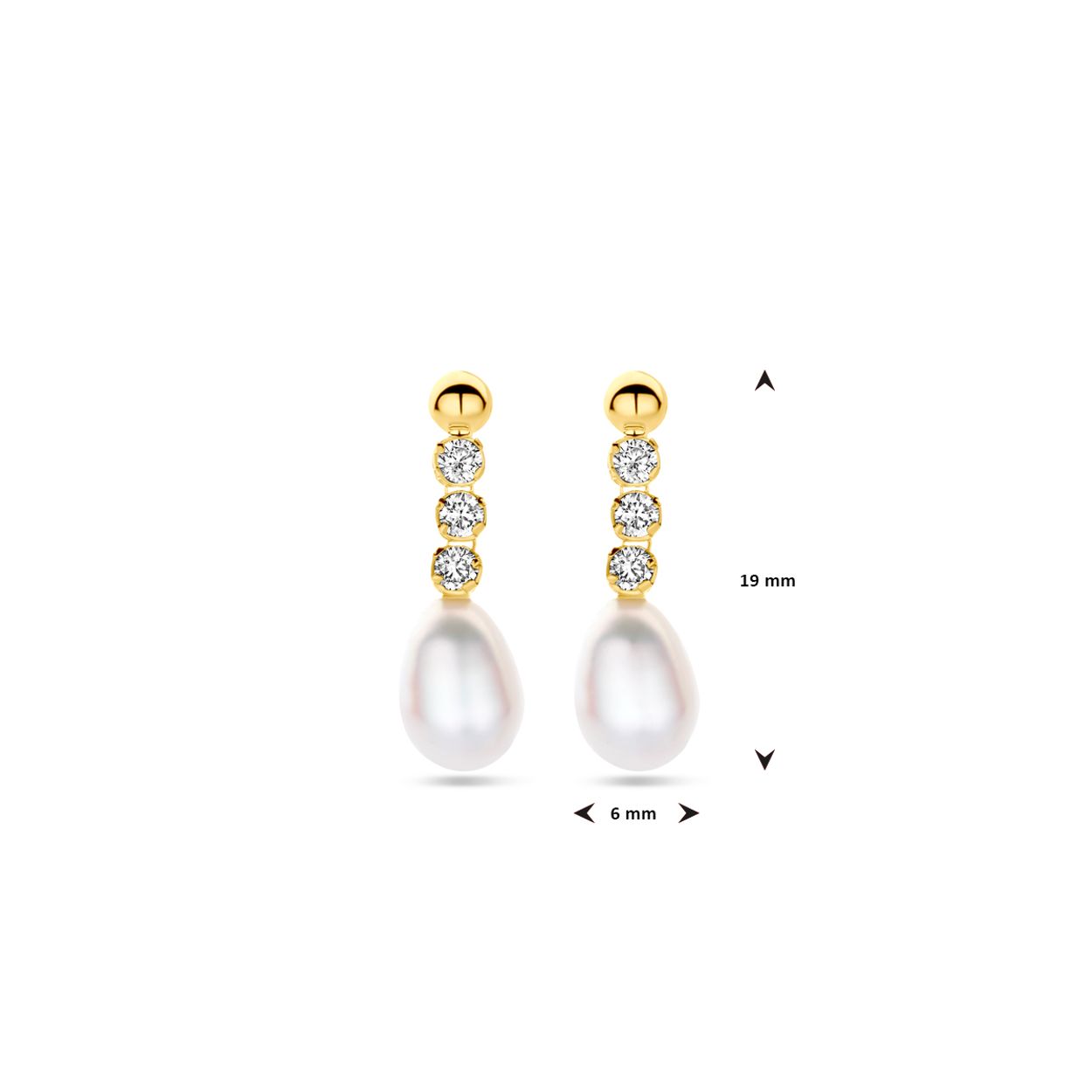 14k Geelgouden oorhangers uitgevoerd met zirkonia en zoetwaterparel. De oorhangers hebben een totale hoogte van 19mm.