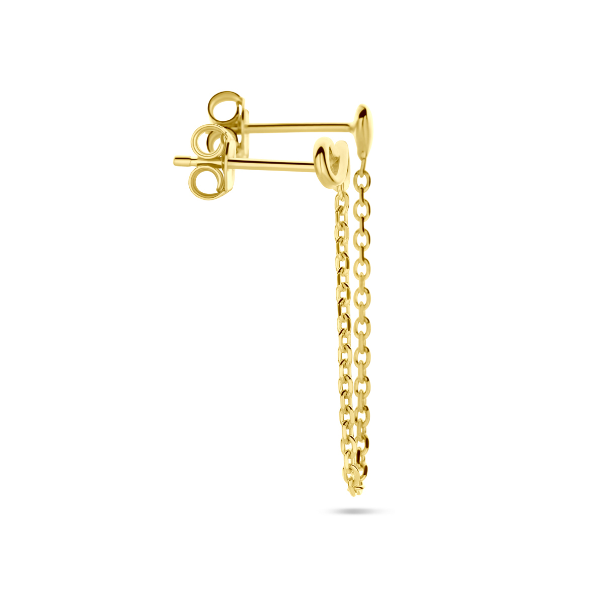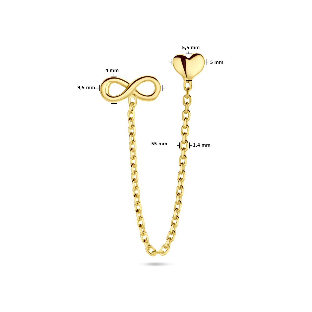 Geelgoud op 925 zilveren oorknop uitgevoerd met hart en infinity. Het hartje heeft een afmeting van 5.5x5mm en de infinity heeft een afmeting van 4x9.5mm. De oorknop wordt per stuk verkocht. Geen garantie op de plating.