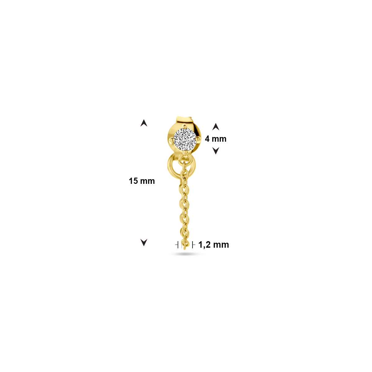 Geelgoud op 925 zilveren oorknop uitgevoerd met wit zirkonia. De oorknop heeft een diameter van 4mm. Deze oorsieraden worden per stuk verkocht ipv per paar. Geen garantie op de plating.