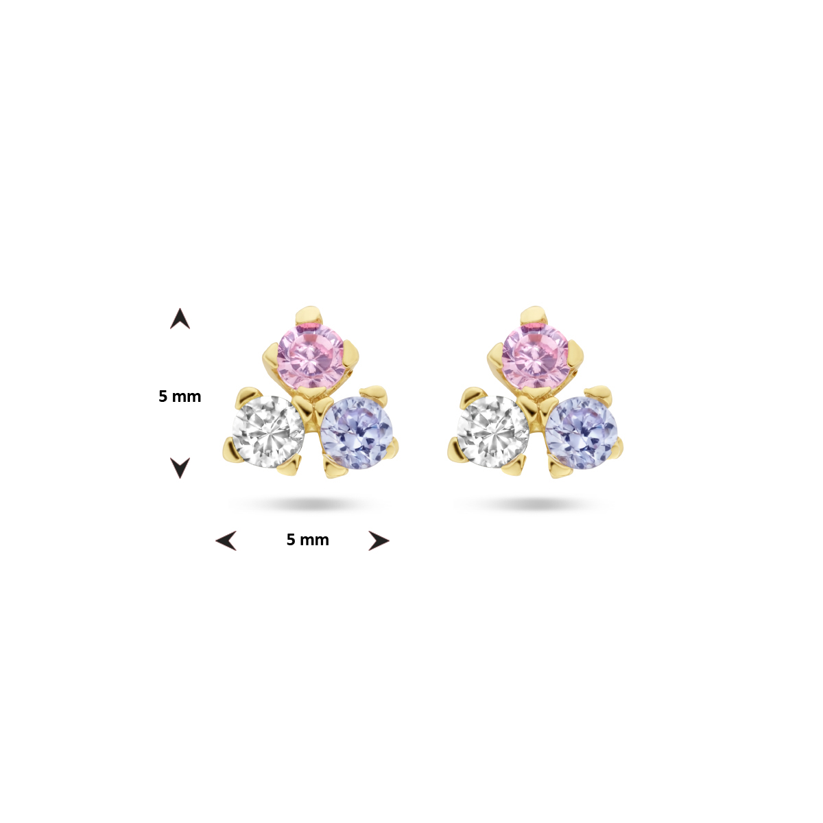 14k Geelgouden oorknoppen met gekleurd zirkonia. De oorknoppen hebben een afmeting van 5x5mm.