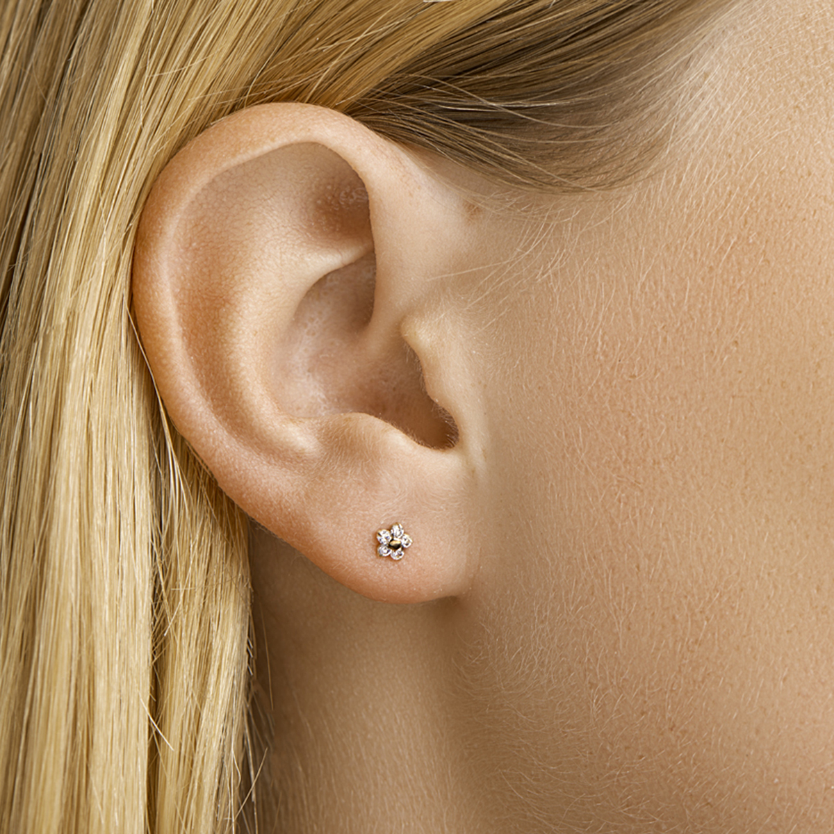Beschrijving: Geelgouden oorknoppen met een bloem en zirkonia.