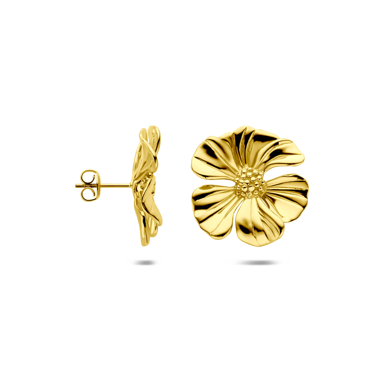 Stalen oorknoppen uitgevoerd in de vorm van een bloem. De oorknoppen hebben een diameter van 26mm en een geel gekleurde ion plating.