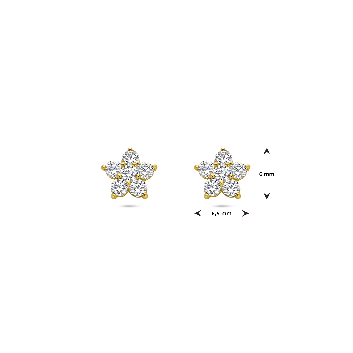 14k Geelgouden oorknoppen uitgevoerd in de vorm van een bloem met zirkonia. De oorknoppen hebben een afmeting van 6x6.5mm.