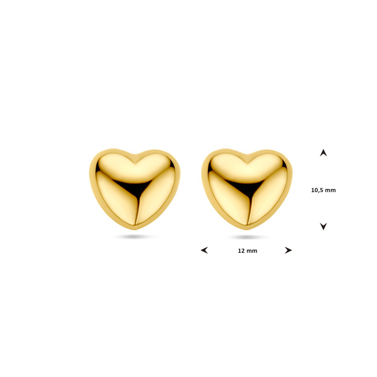 Geelgoud op 925 zilveren oorknoppen uitgevoerd in de vorm van een hart. De oorknoppen hebben een afmeting van 10.5x12mm. Geen garantie op de plating.
