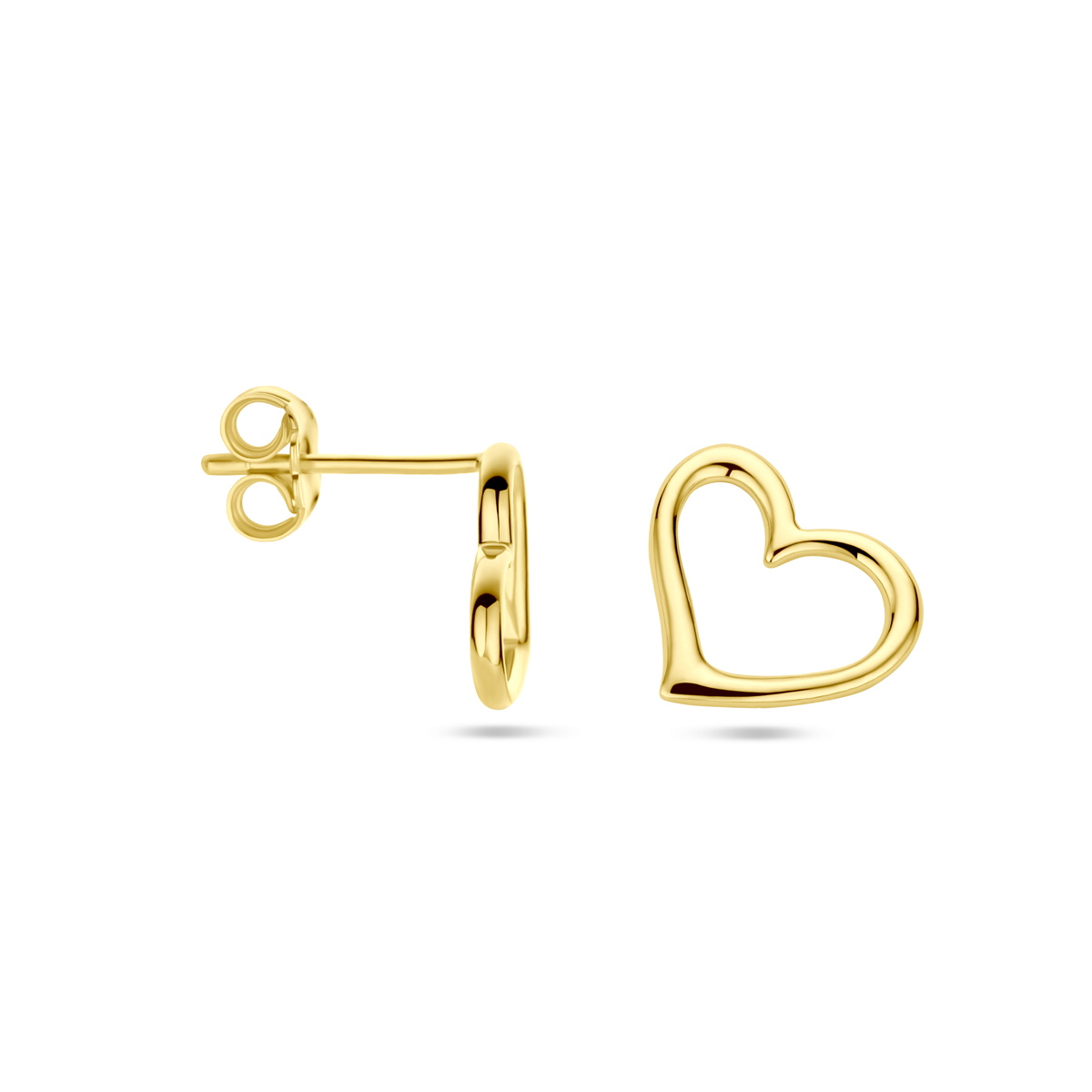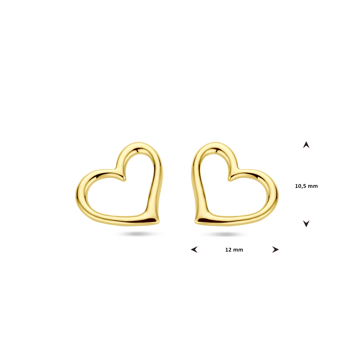 Geelgoud op 925 zilveren oorknoppen uitgevoerd in de vorm van een hart. De oorknoppen hebben een afmeting van 10.5x12mm. Geen garantie op de plating.
