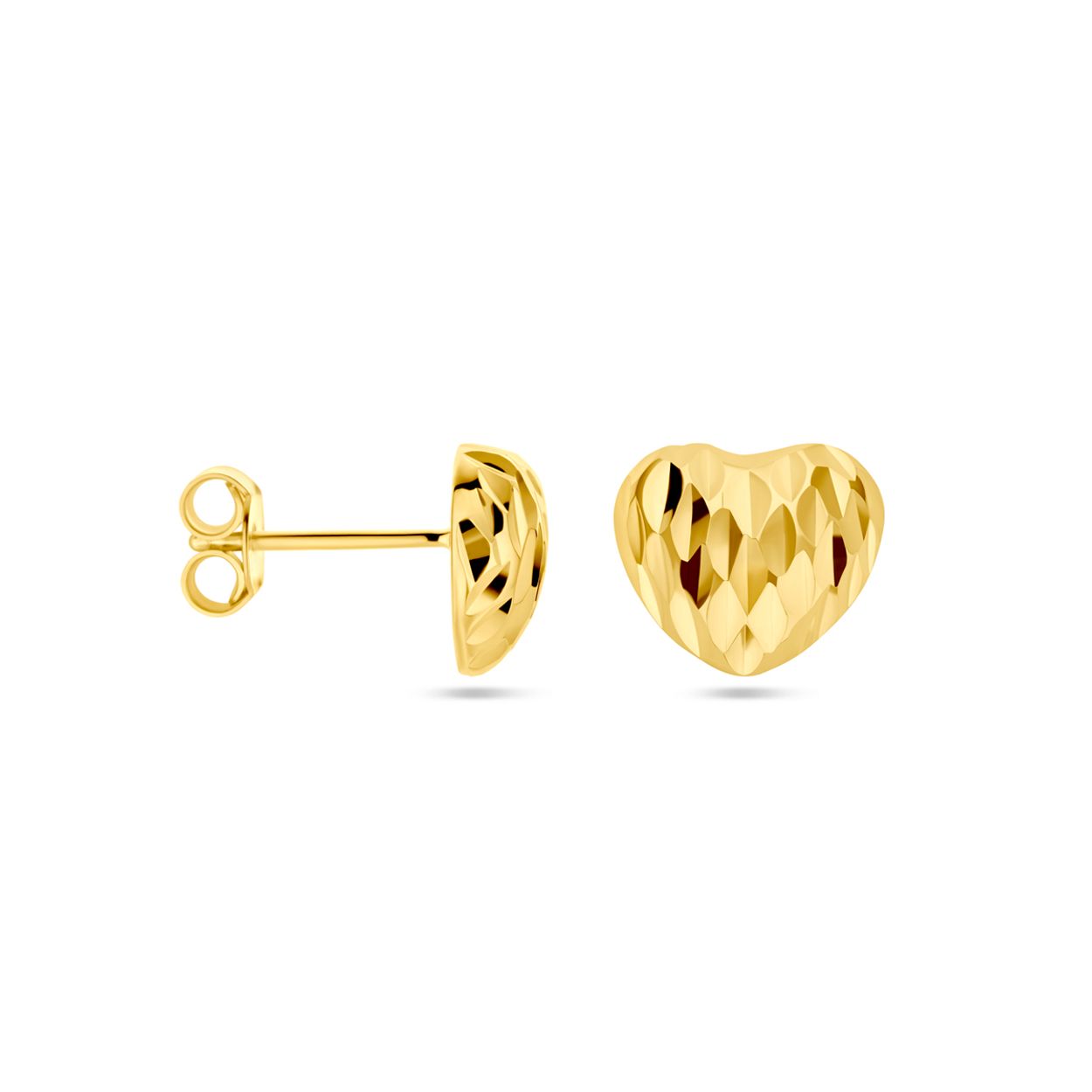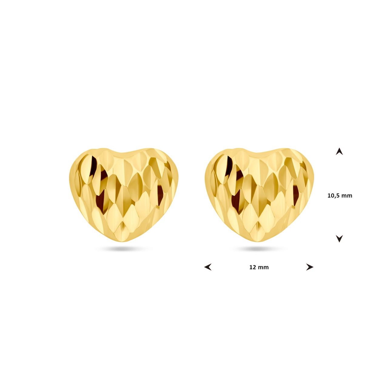 Geelgoud op 925 zilveren oorknoppen uitgevoerd in de vorm van een hart. De oorknoppen hebben een afmeting van 10.5x12mm. Geen garantie op de plating.