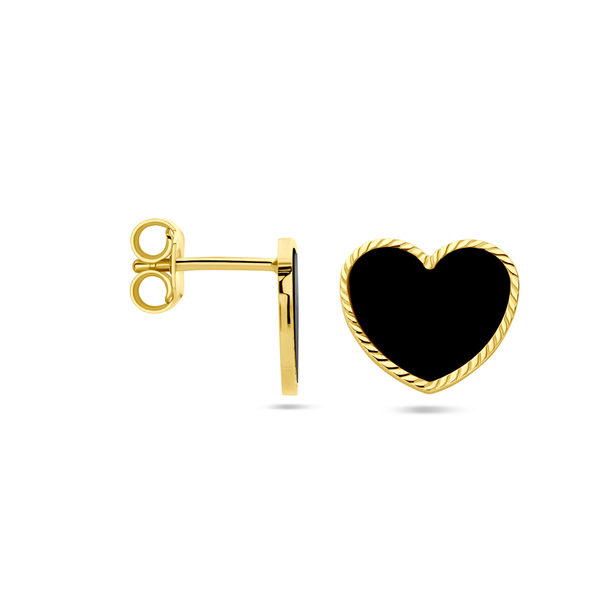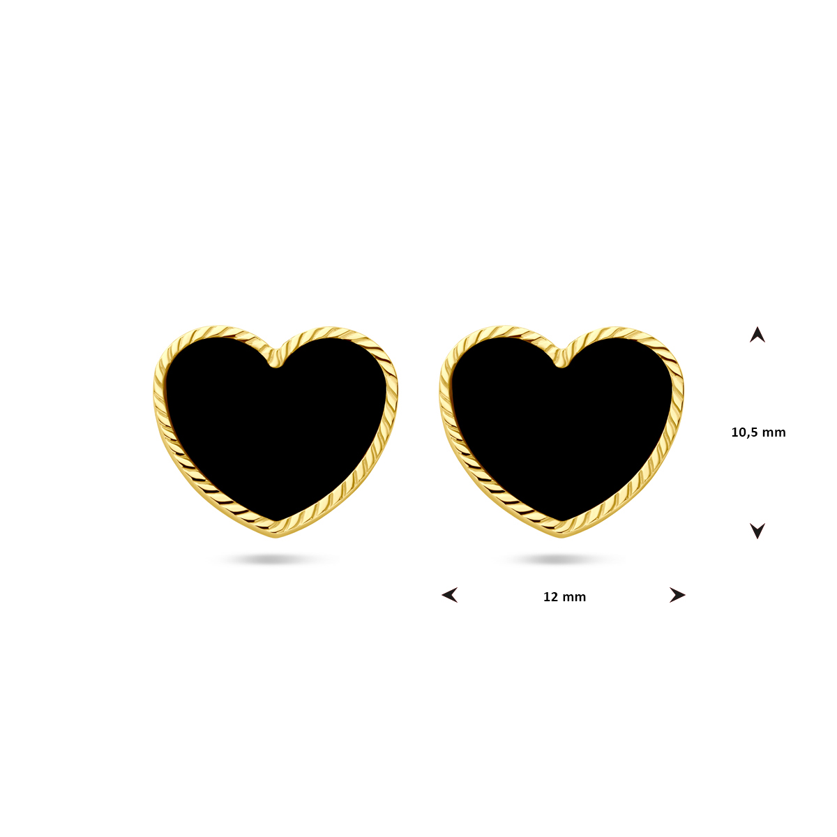 14k Geelgouden oorknoppen in de vorm van een hart met onyx. De oorknoppen hebben een afmeting van 10.5x12mm.
