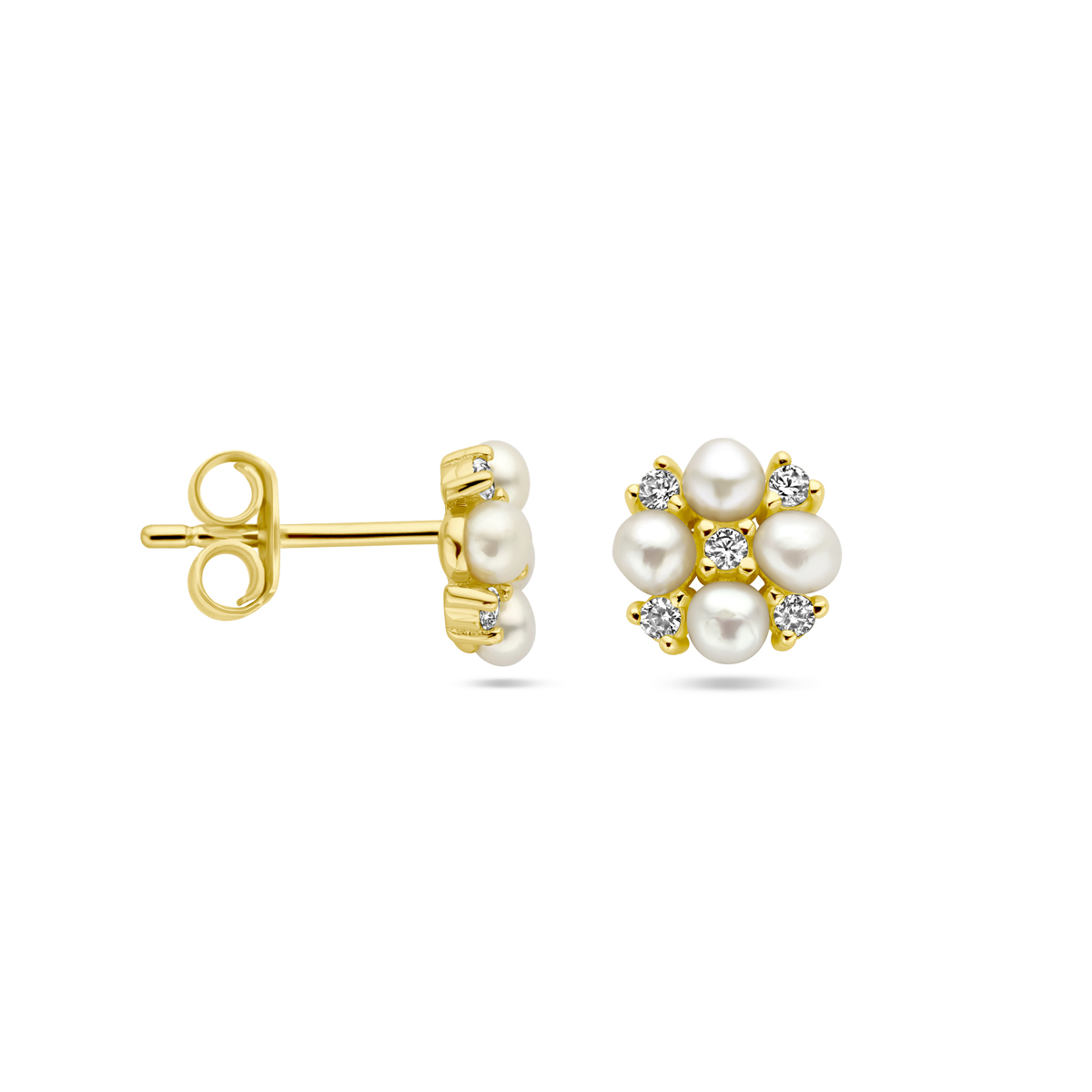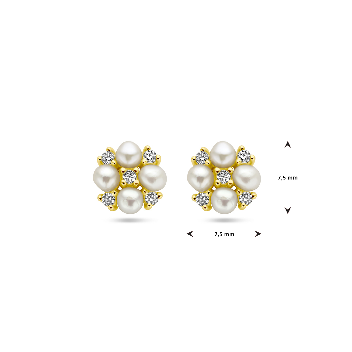 Geelgoud op 925 zilveren oorknoppen uitgevoerd met zoetwaterparels en zirkonia. De oorknoppen hebben een afmeting van 7.5x7.5mm. Geen garantie op de plating.
