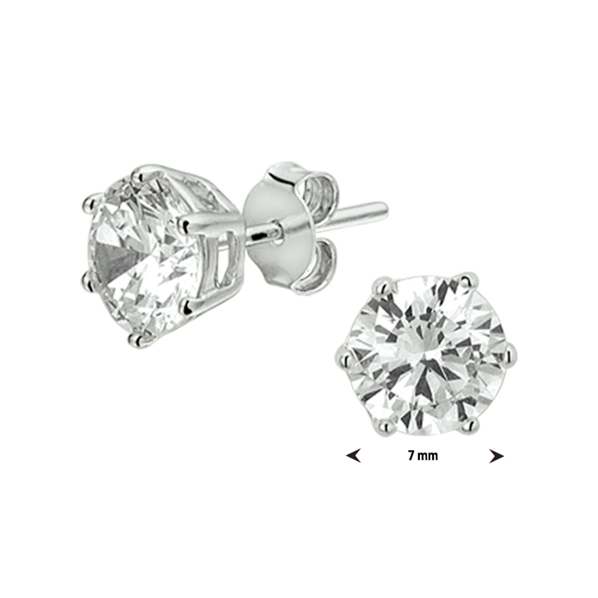 Beschrijving: Stijlvolle gerhodineerd zilveren oorknoppen uitgevoerd met  een briljant geslepen zirkonia in een chaton zetting en stevige poussette sluiting. De zirkonia steen heeft een afmeting van 7mm.