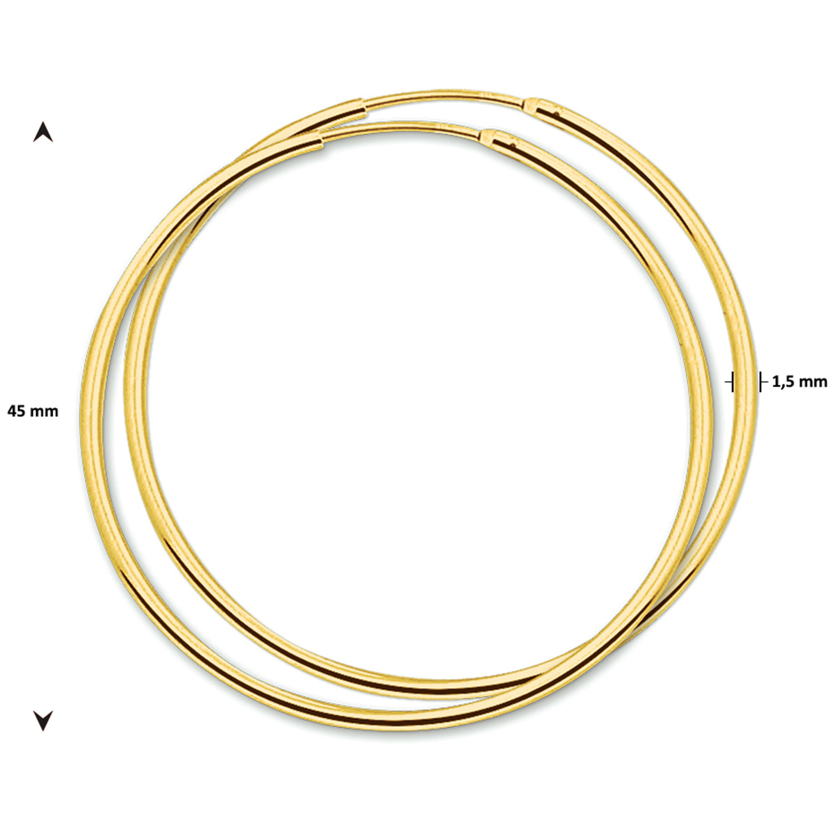 Beschrijving: Een goede garderobe begint bij de basis en ditzelfde geldt voor een tijdloze sieradencollectie! Deze basic creolen passen bij iedere outfit en zijn met veel andere sieraden te combineren. Details: Geelgouden creolen met een ronde buis en een scharnier-sluiting. De diameter van deze creolen is 44mm.
