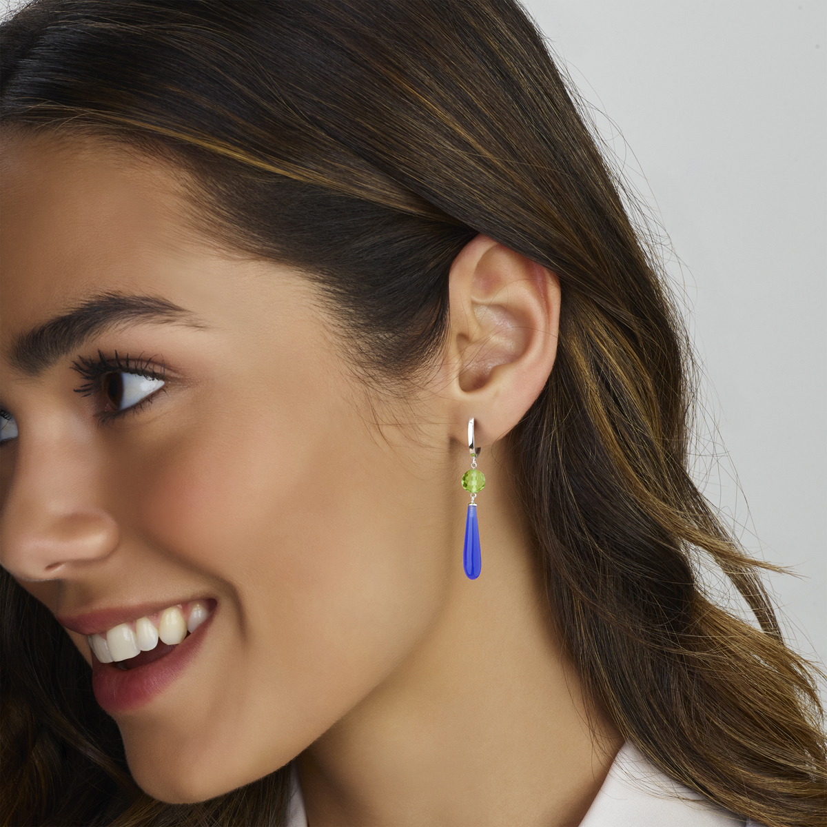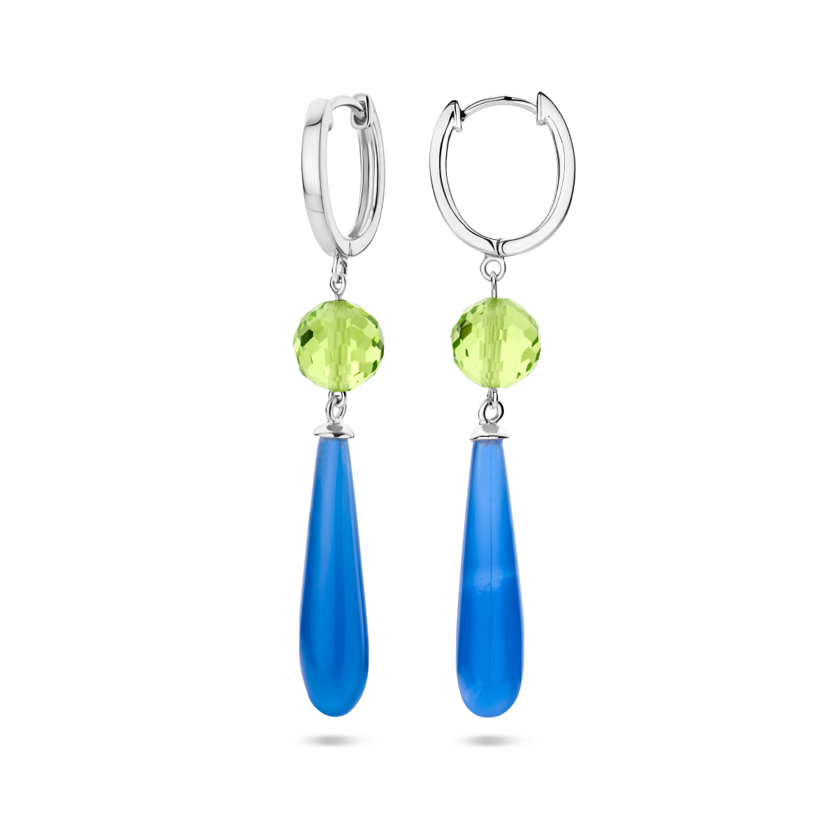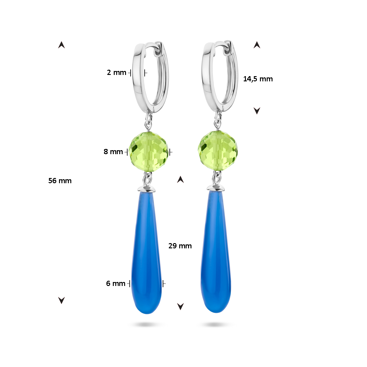 Gerhodineerd 925 zilveren klapoorringen met groen en blauw kleurstenen. De oorhangers hebben een totale hoogte van 56mm.