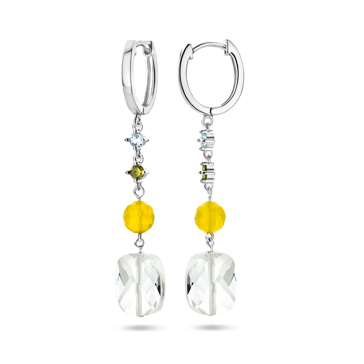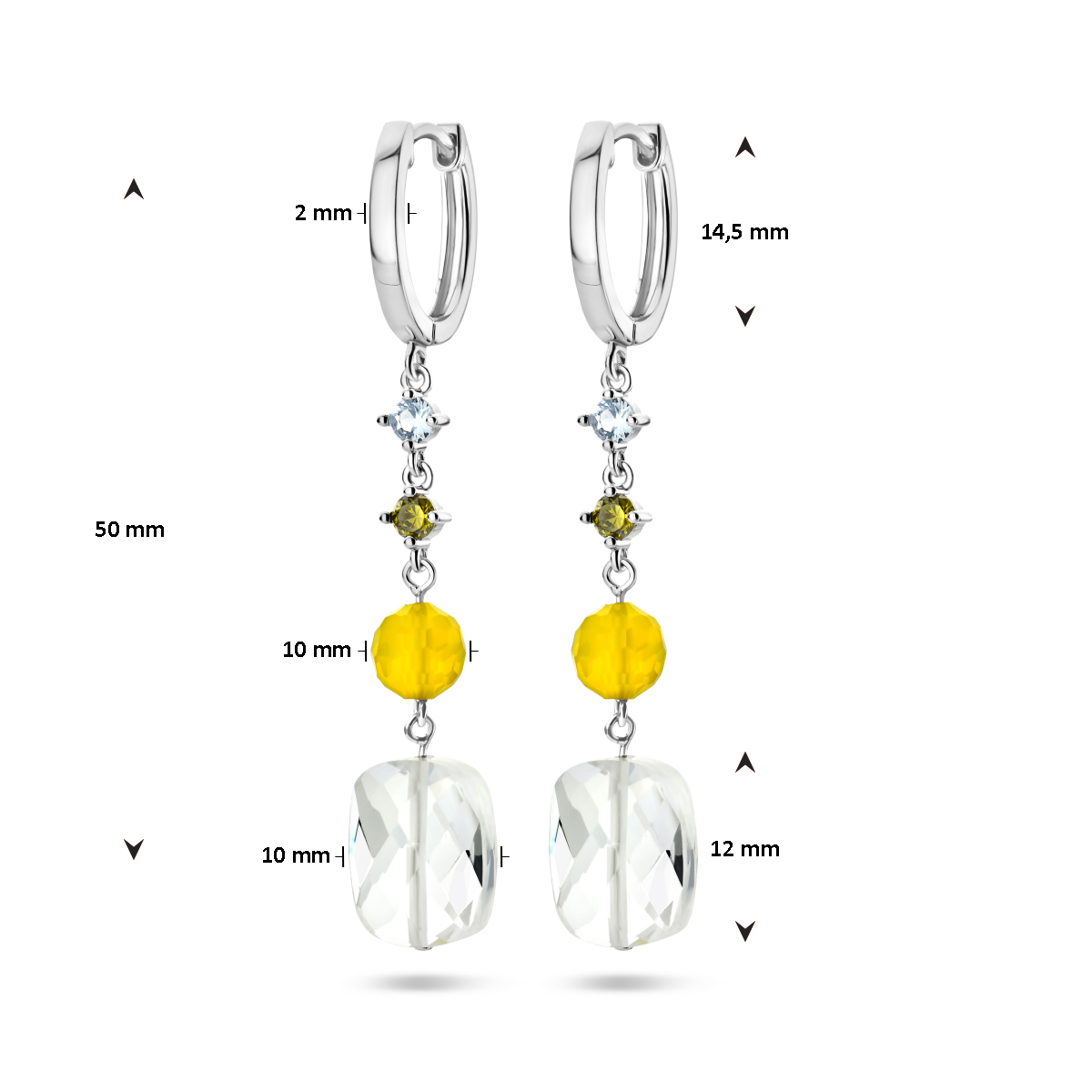 Gerhodineerd 925 zilveren klapoorringen met een totale hoogte van 50mm. De oorringen zijn uitgevoerd met synth. blauw spinel, olijfgroen zirkonia en wit zirkonia.