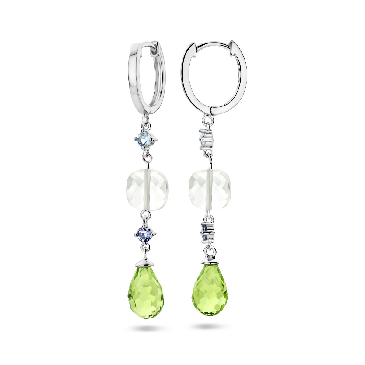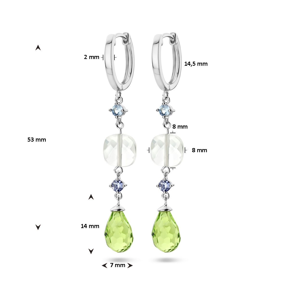 Gerhodineerd 925 zilveren klapoorringen met een totale hoogte van 53mm. De oorringen zijn uitgevoerd met synth. blauw spinel, wit en tanzaniet zirkonia.