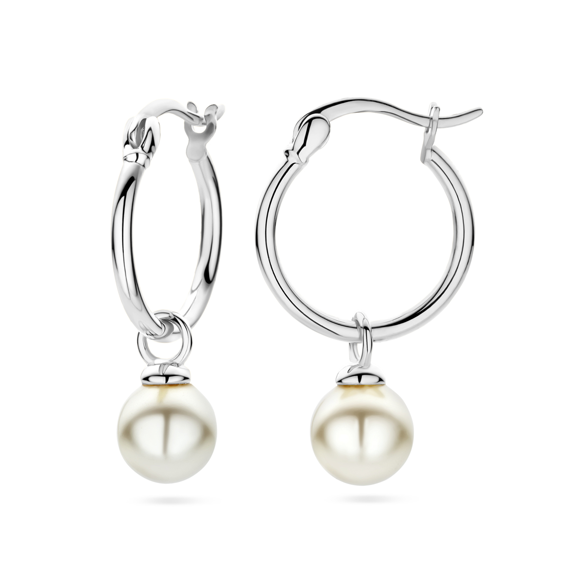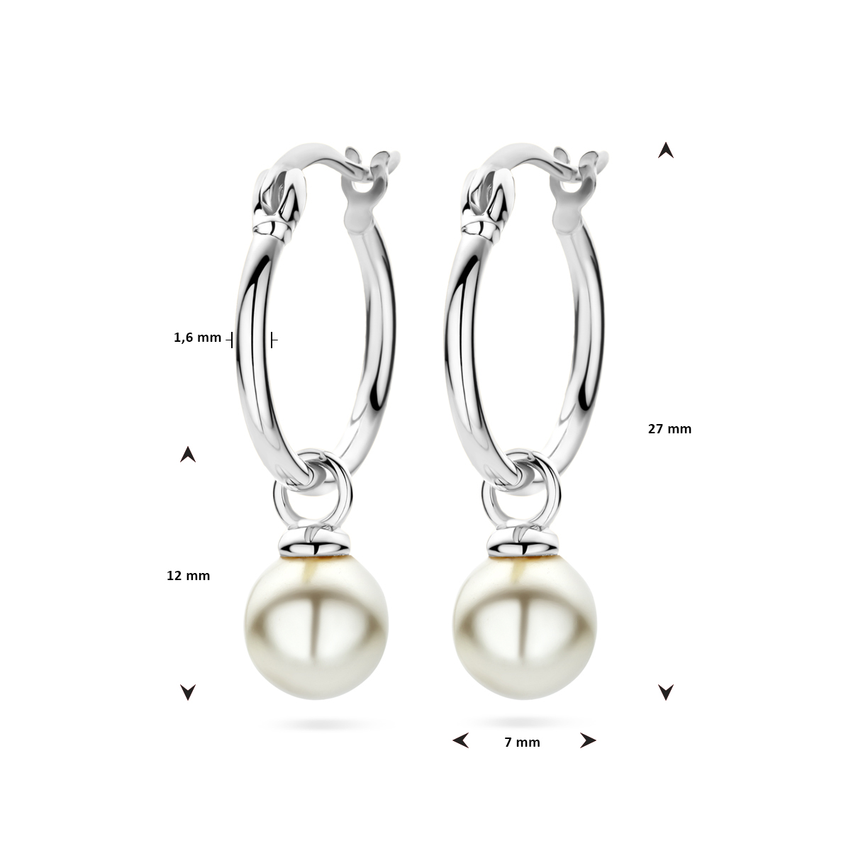 Gerhodineerd 925 zilveren oorringen uitgevoerd met synthetische parel. De oorringen hebben een totale hoogte van 27mm.