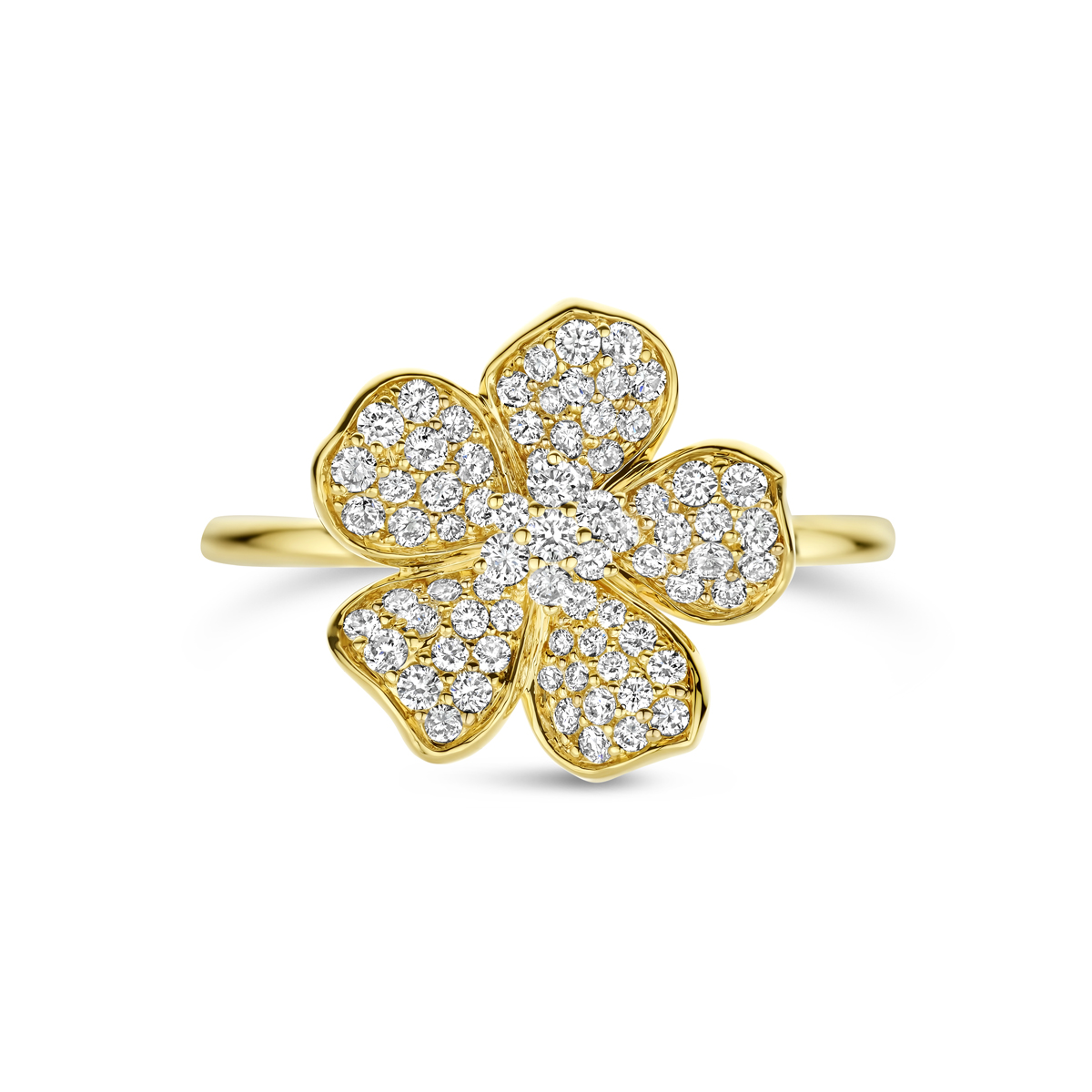 14k Geelgouden ring uitgevoerd met een bloem en diamant. De ring heeft een afmeting van 14x14mm. Het totale diamantgewicht is 0.50ct.