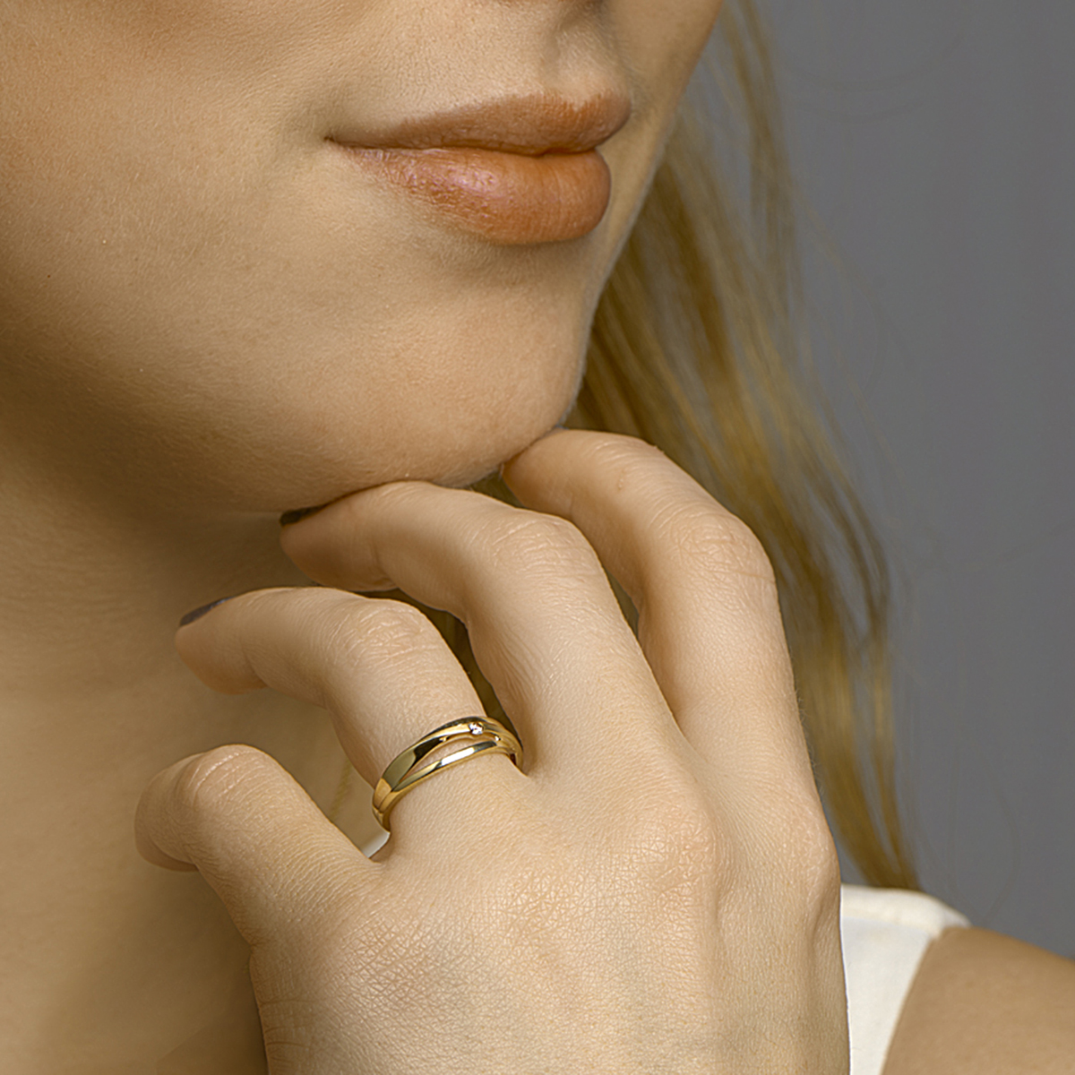 14k geelgouden ring uitgevoerd met een schitterende diamant. De ring heeft een breedte van 5.5mm.