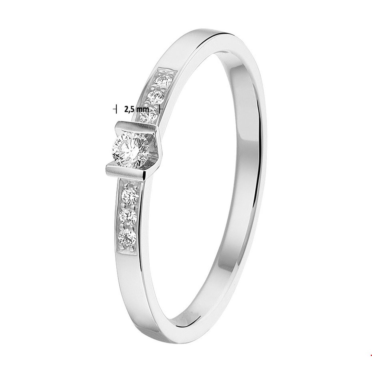 Chique ring in witgoud met een palladium legering van 2.5mm breed uitgevoerd met een luxe ingespannen briljant geslepen diamant 0.085ct. De ring heeft een tijdloze elegantie in 14K witgoud en een sprankelende ingespannen diamant.