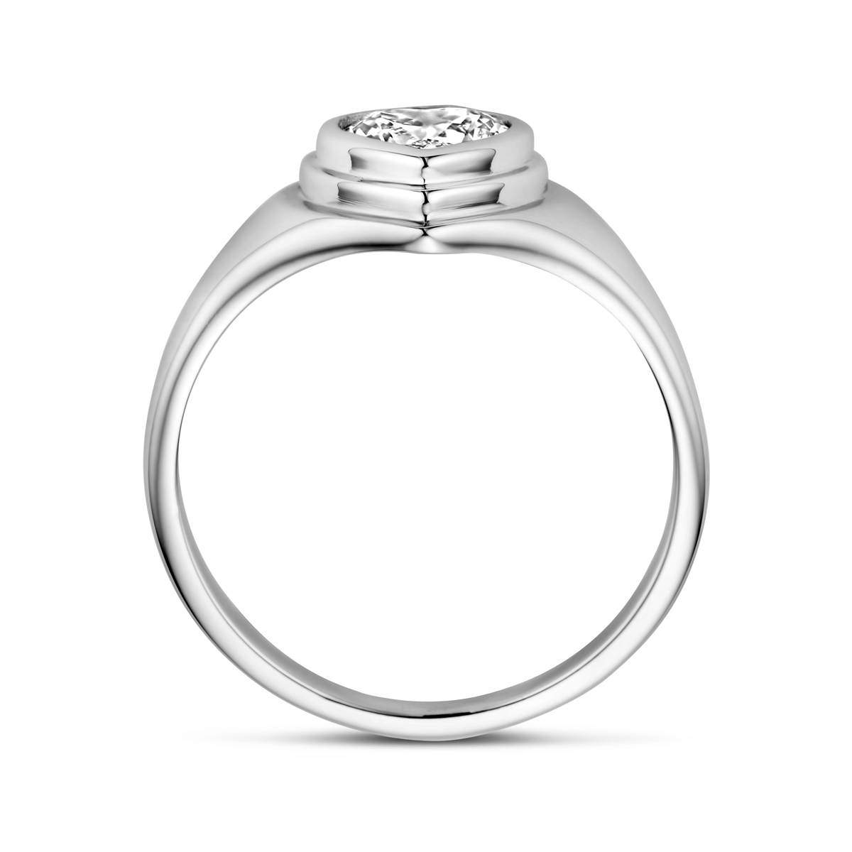 Gerhodineerd 925 zilveren ring uitgevoerd in de vorm van een hartje met zirkonia. De ring heeft een breedte van 10mm.