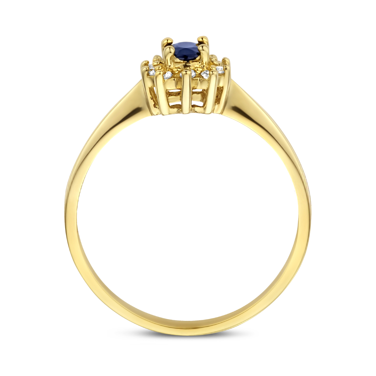 Beschrijving: Ring in de stijl van de bekende verlovingsring van prinses Diana. Sieraden met Koninklijke allure. Details: Geelgouden ring met een rozet van saffier en diamant. De ring is onderdeel van een set.